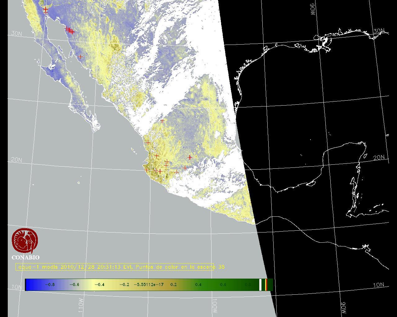 Se considera como punto de calor al elemento espacial mínimo de la imagen (pixel) que reporta una temperatura elevada. Para las imágenes diurnas la temperatura mínima considera es de 42 C y para las imágenes nocturnas es de 25 C. |