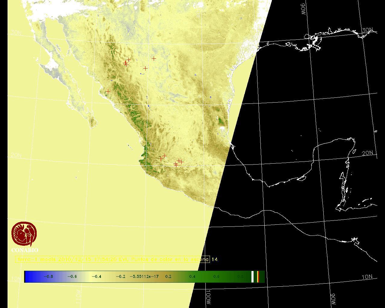 Se considera como punto de calor al elemento espacial mínimo de la imagen (pixel) que reporta una temperatura elevada. Para las imágenes diurnas la temperatura mínima considera es de 42 C y para las imágenes nocturnas es de 25 C. |