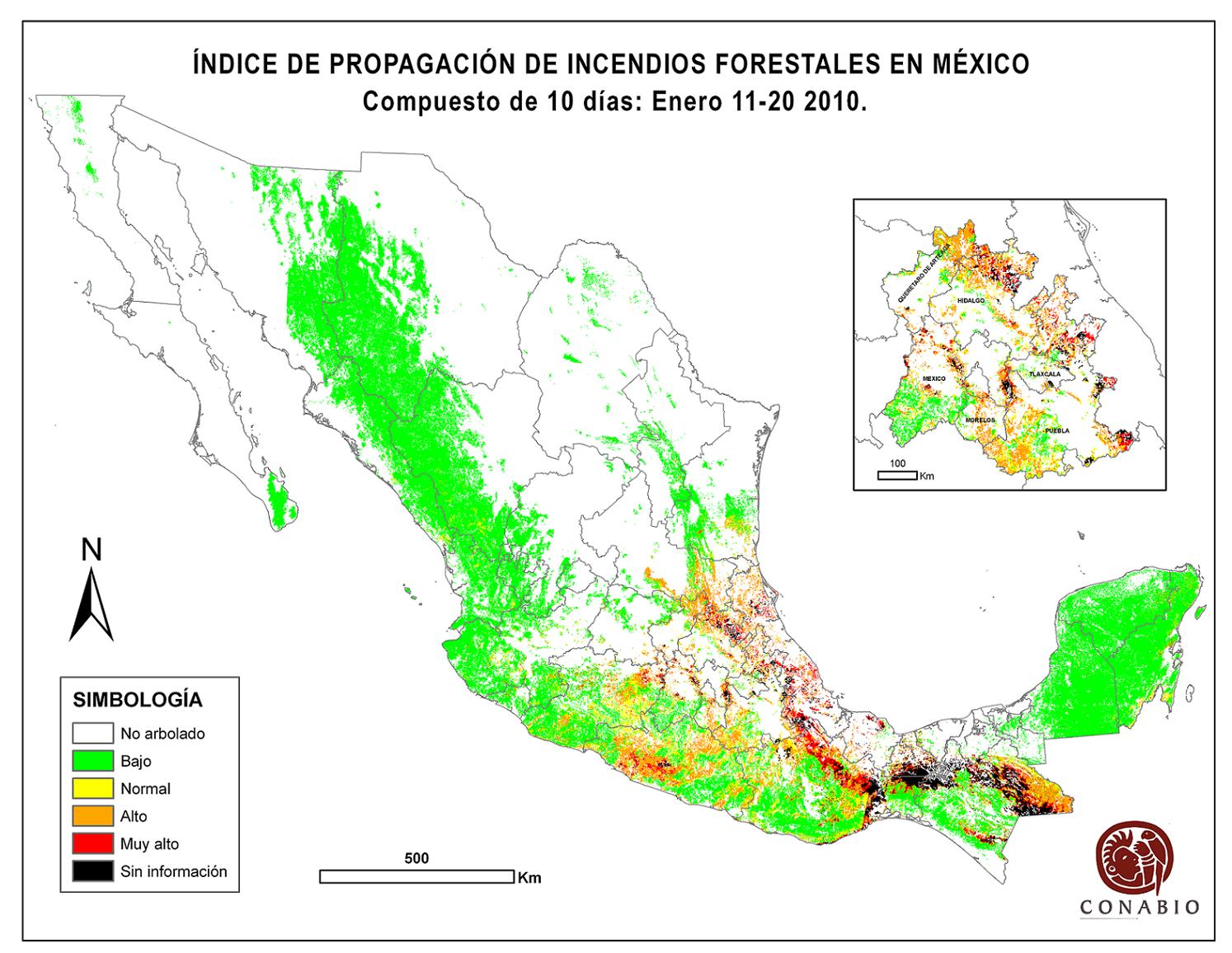 Indica el riesgo de propagación de incendios forestales. Se basa exclusivamente en el vigor de la vegetación, cuanto más seca está la vegetación, más rápido se podrá extender el posible fuego (incendio). Los valores para el índice son: Bajo -> Normal -> Alto -> Muy alto NA (No aplica) se refiere al agua, vegetación no arbolada y los usos de suelo mostrados en gris. ND (No disponible) indica que no hubo información para generar el índice. |