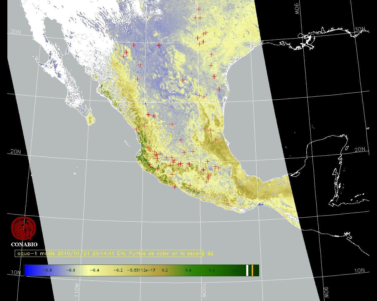 Se considera como punto de calor al elemento espacial mínimo de la imagen (pixel) que reporta una temperatura elevada. Para las imágenes diurnas la temperatura mínima considera es de 42 C y para las imágenes nocturnas es de 25 C. |