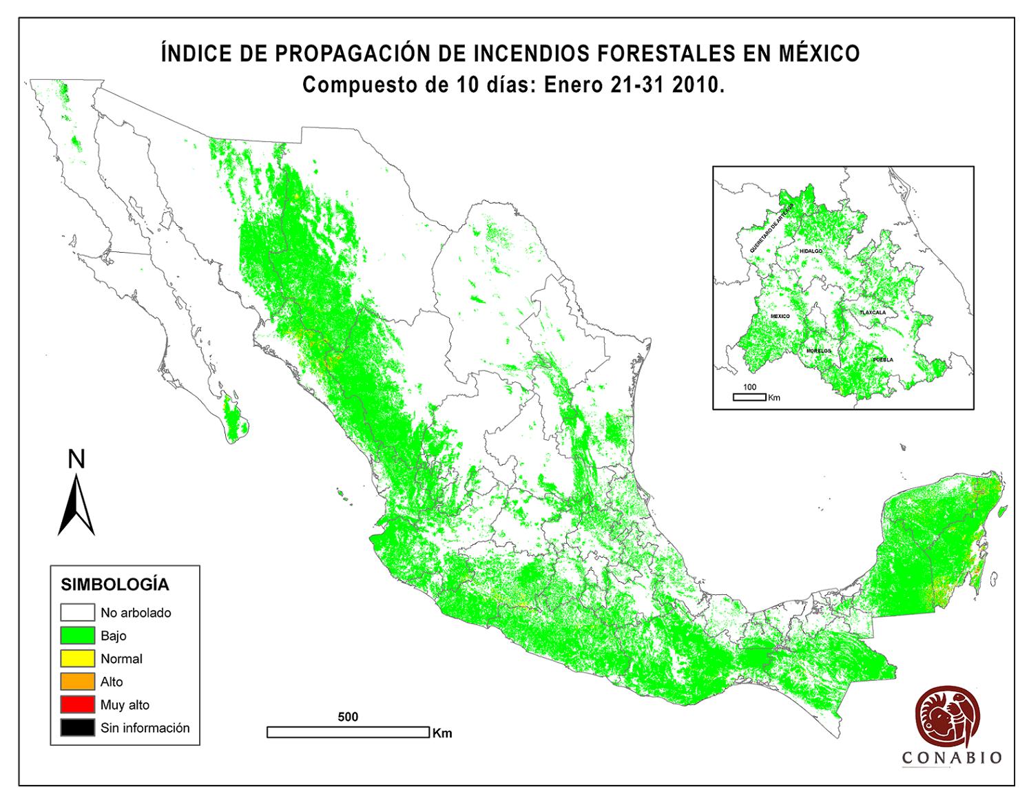 Indica el riesgo de propagación de incendios forestales. Se basa exclusivamente en el vigor de la vegetación, cuanto más seca está la vegetación, más rápido se podrá extender el posible fuego (incendio). Los valores para el índice son: Bajo -> Normal -> Alto -> Muy alto NA (No aplica) se refiere al agua, vegetación no arbolada y los usos de suelo mostrados en gris. ND (No disponible) indica que no hubo información para generar el índice. |