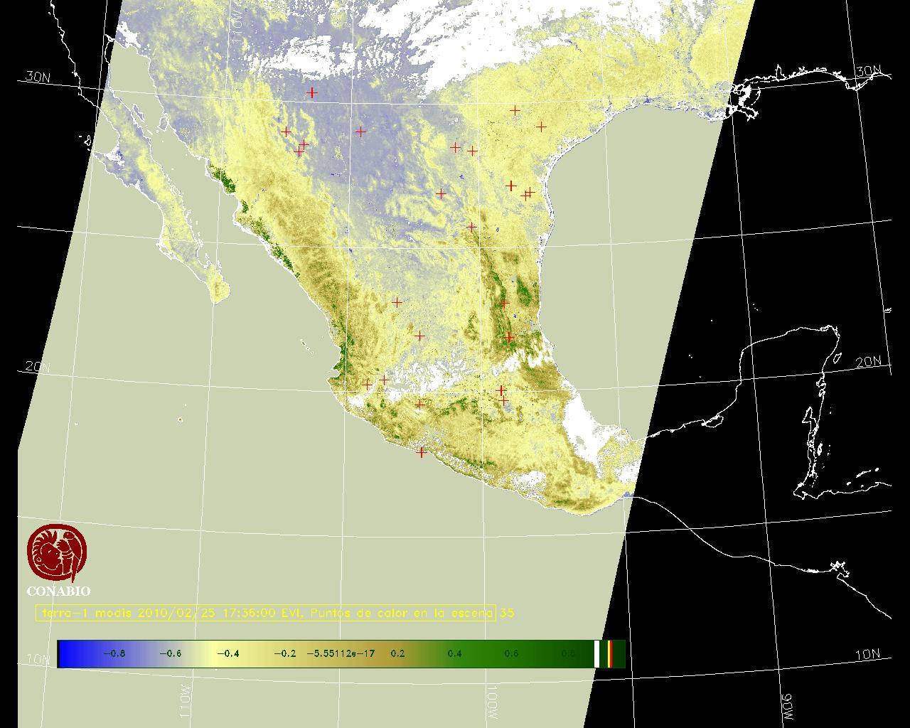 Se considera como punto de calor al elemento espacial mínimo de la imagen (pixel) que reporta una temperatura elevada. Para las imágenes diurnas la temperatura mínima considera es de 42 C y para las imágenes nocturnas es de 25 C. |