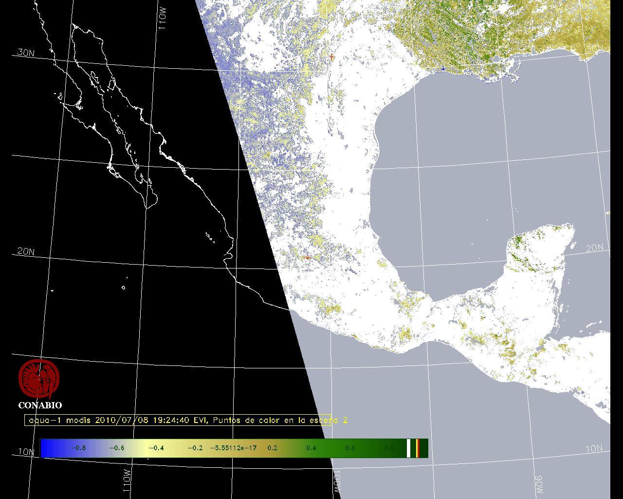 Se considera como punto de calor al elemento espacial mínimo de la imagen (pixel) que reporta una temperatura elevada. Para las imágenes diurnas la temperatura mínima considera es de 42 C y para las imágenes nocturnas es de 25 C. |