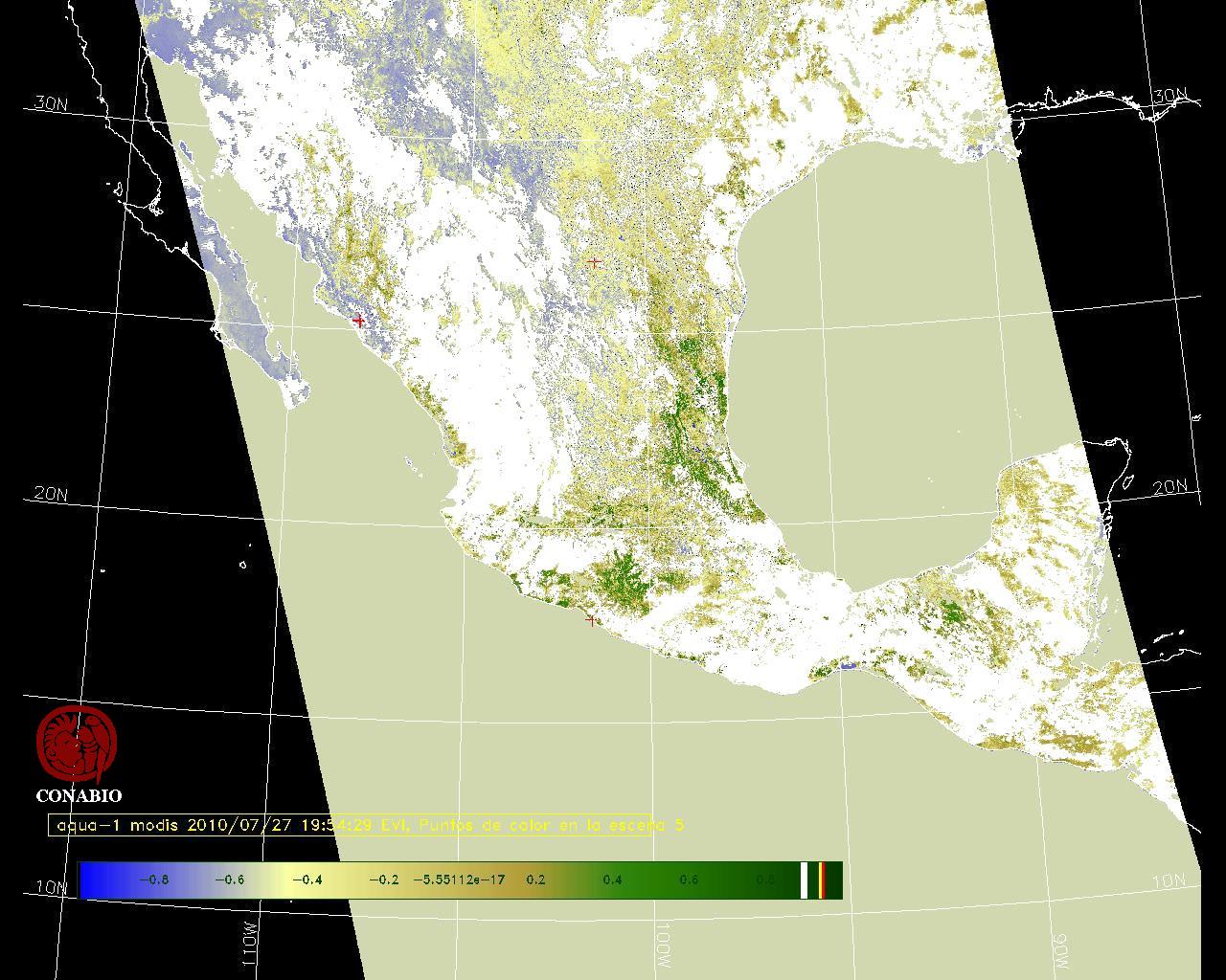 Se considera como punto de calor al elemento espacial mínimo de la imagen (pixel) que reporta una temperatura elevada. Para las imágenes diurnas la temperatura mínima considera es de 42 C y para las imágenes nocturnas es de 25 C. |