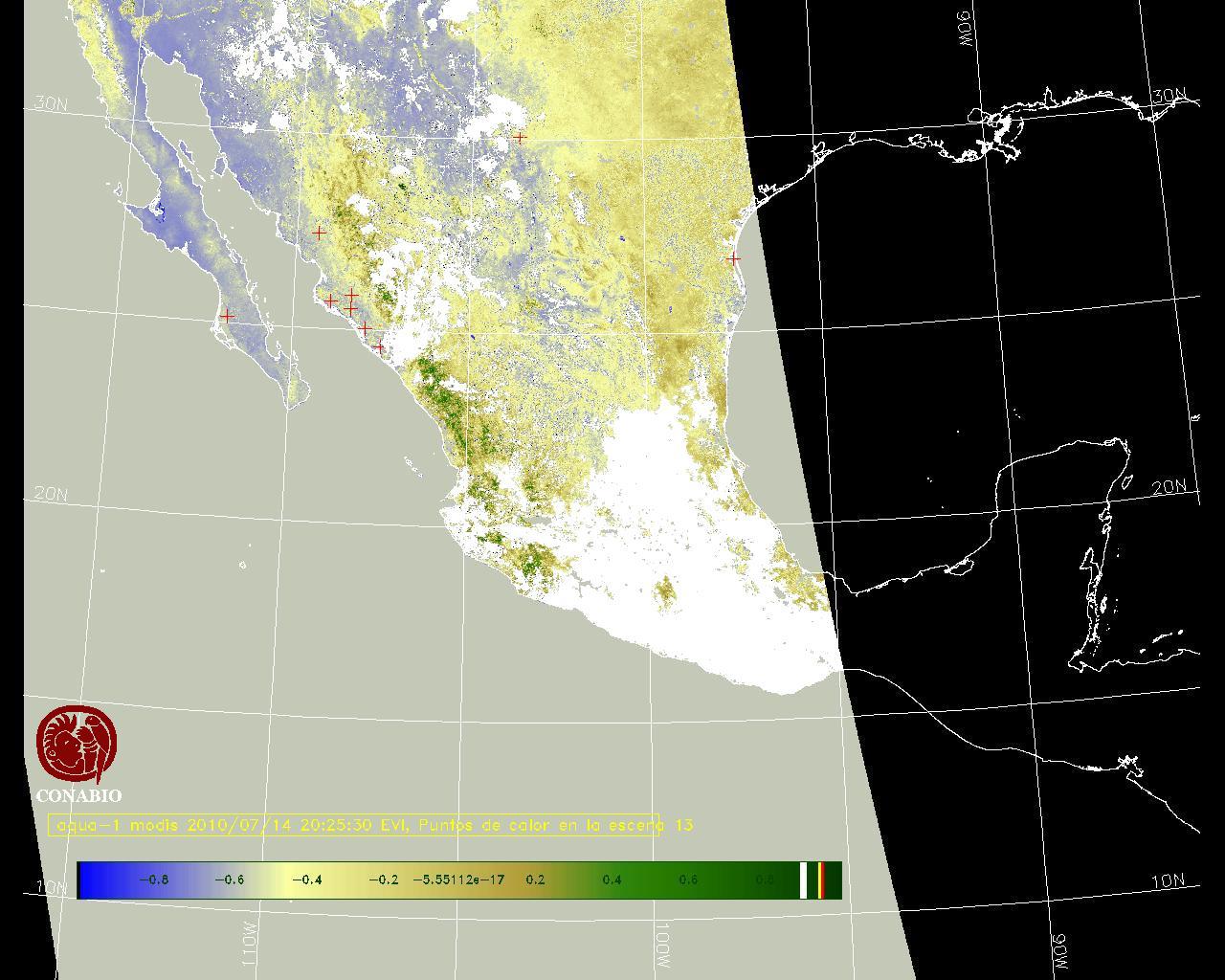 Se considera como punto de calor al elemento espacial mínimo de la imagen (pixel) que reporta una temperatura elevada. Para las imágenes diurnas la temperatura mínima considera es de 42 C y para las imágenes nocturnas es de 25 C. |