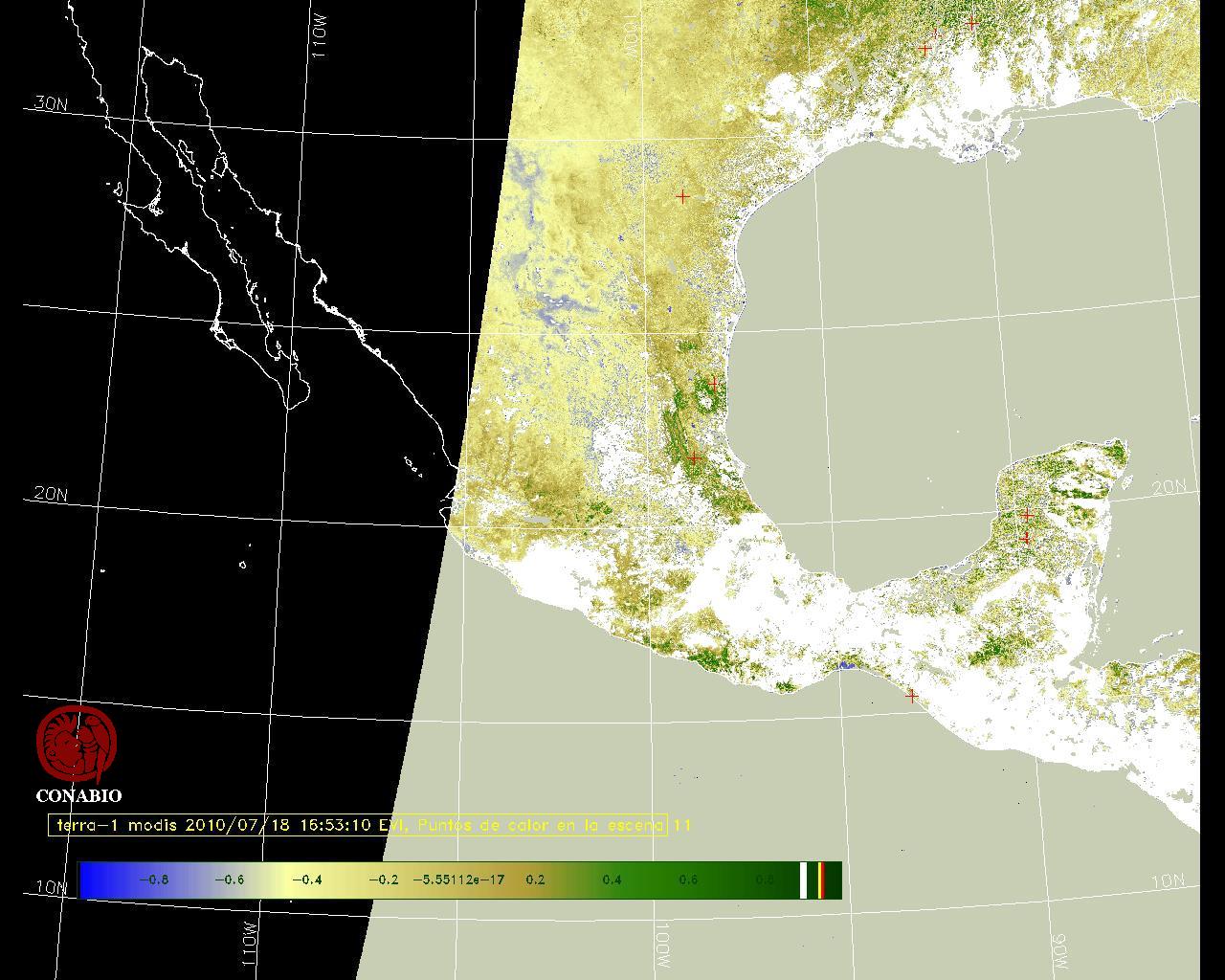 Se considera como punto de calor al elemento espacial mínimo de la imagen (pixel) que reporta una temperatura elevada. Para las imágenes diurnas la temperatura mínima considera es de 42 C y para las imágenes nocturnas es de 25 C. |
