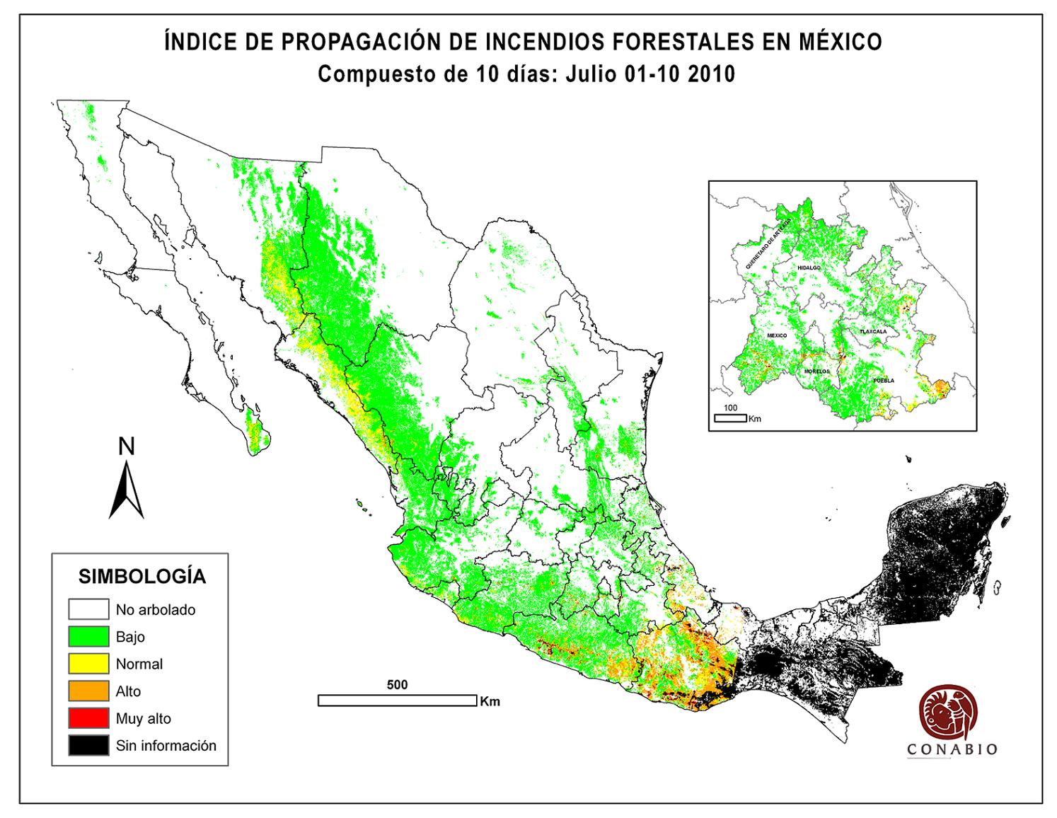 Indica el riesgo de propagación de incendios forestales. Se basa exclusivamente en el vigor de la vegetación, cuanto más seca está la vegetación, más rápido se podrá extender el posible fuego (incendio). Los valores para el índice son: Bajo -> Normal -> Alto -> Muy alto NA (No aplica) se refiere al agua, vegetación no arbolada y los usos de suelo mostrados en gris. ND (No disponible) indica que no hubo información para generar el índice. |