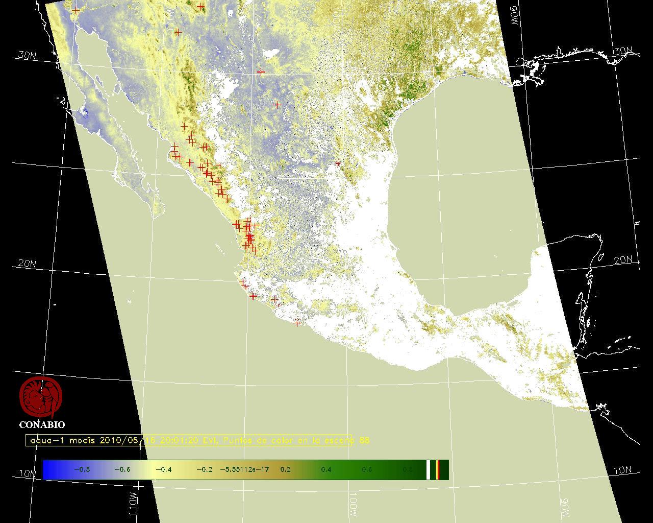 Se considera como punto de calor al elemento espacial mínimo de la imagen (pixel) que reporta una temperatura elevada. Para las imágenes diurnas la temperatura mínima considera es de 42 C y para las imágenes nocturnas es de 25 C. |