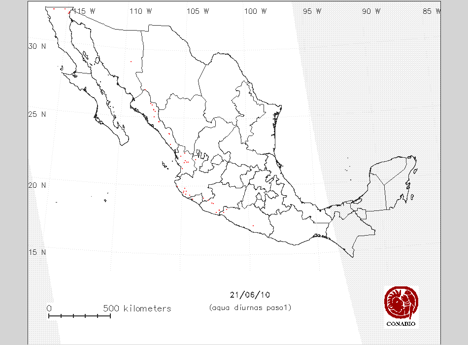 Se considera como punto de calor al elemento espacial mínimo de la imagen (pixel) que reporta una temperatura elevada. Para las imágenes diurnas la temperatura mínima considera es de 42 C y para las imágenes nocturnas es de 25 C. |