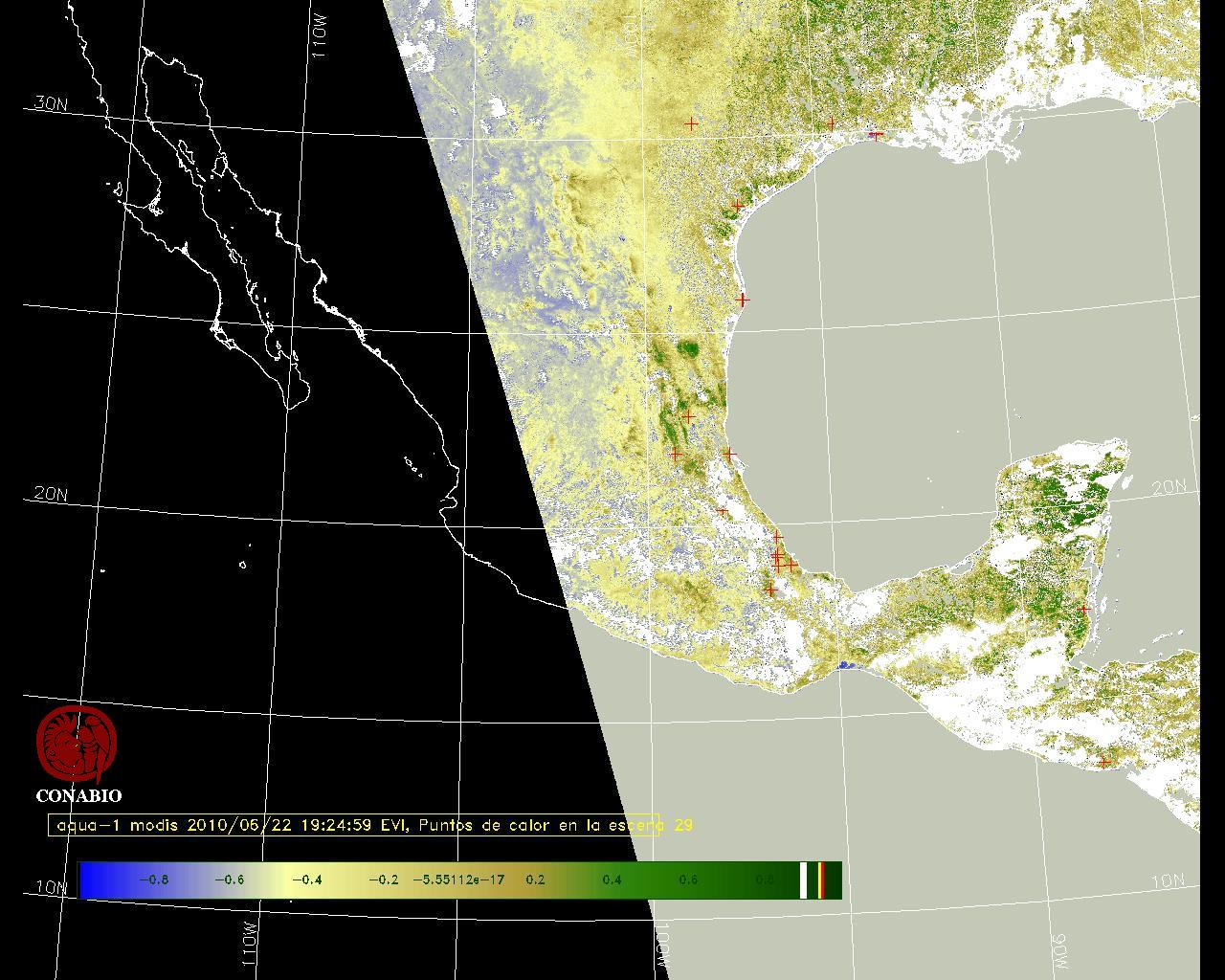 Se considera como punto de calor al elemento espacial mínimo de la imagen (pixel) que reporta una temperatura elevada. Para las imágenes diurnas la temperatura mínima considera es de 42 C y para las imágenes nocturnas es de 25 C. |