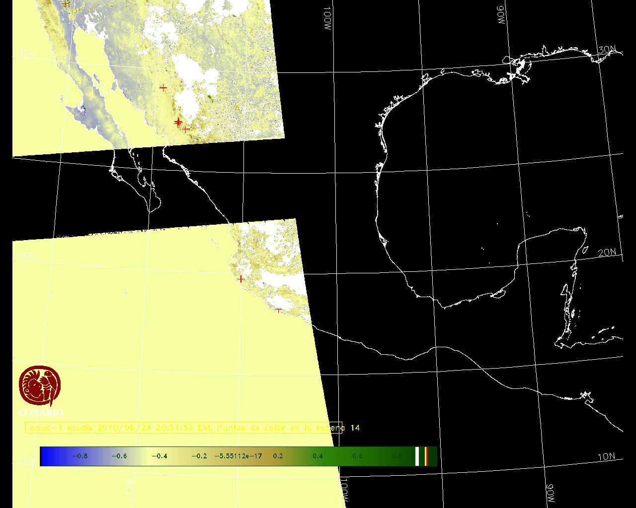 Se considera como punto de calor al elemento espacial mínimo de la imagen (pixel) que reporta una temperatura elevada. Para las imágenes diurnas la temperatura mínima considera es de 42 C y para las imágenes nocturnas es de 25 C. |