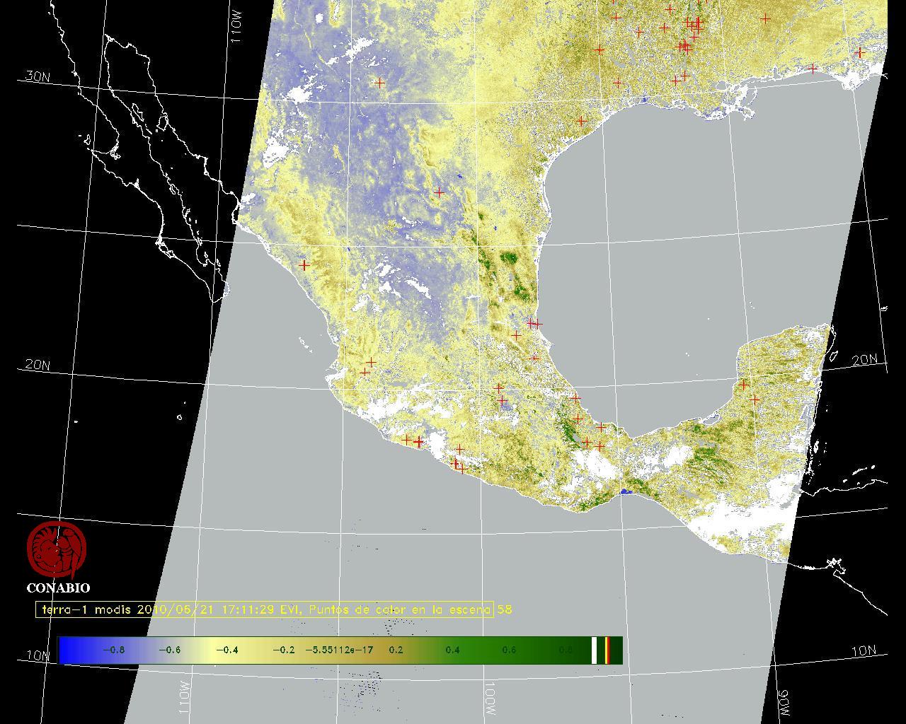 Se considera como punto de calor al elemento espacial mínimo de la imagen (pixel) que reporta una temperatura elevada. Para las imágenes diurnas la temperatura mínima considera es de 42 C y para las imágenes nocturnas es de 25 C. |