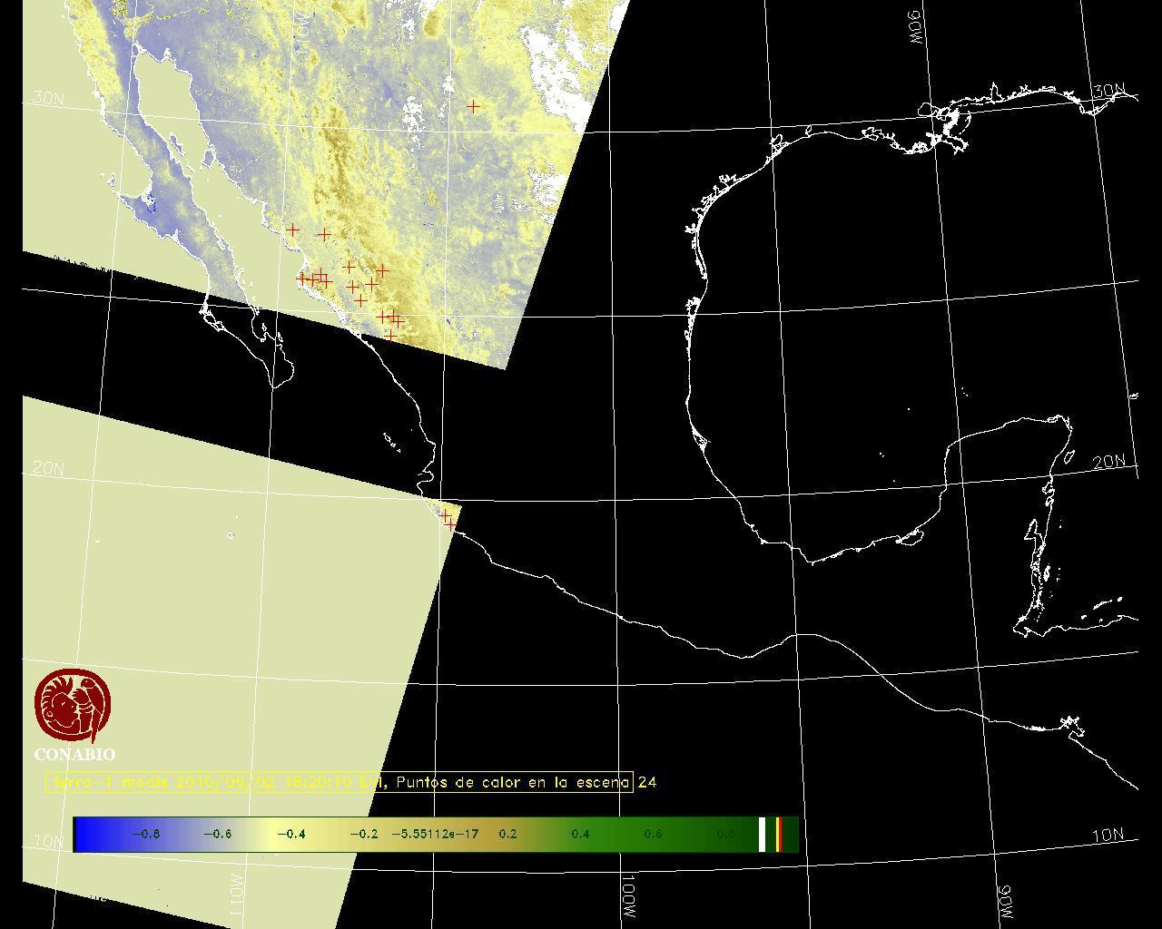 Se considera como punto de calor al elemento espacial mínimo de la imagen (pixel) que reporta una temperatura elevada. Para las imágenes diurnas la temperatura mínima considera es de 42 C y para las imágenes nocturnas es de 25 C. |