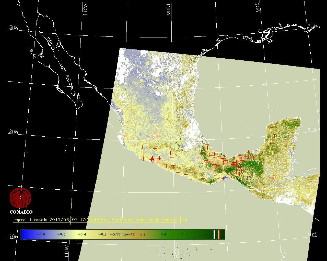 Se considera como punto de calor al elemento espacial mínimo de la imagen (pixel) que reporta una temperatura elevada. Para las imágenes diurnas la temperatura mínima considera es de 42 C y para las imágenes nocturnas es de 25 C. |