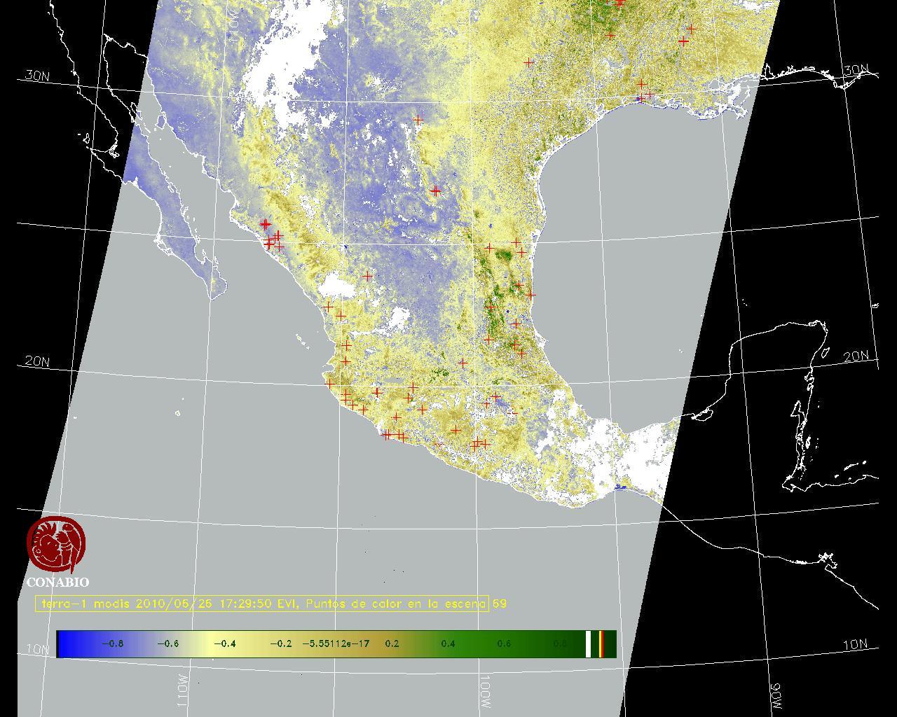 Se considera como punto de calor al elemento espacial mínimo de la imagen (pixel) que reporta una temperatura elevada. Para las imágenes diurnas la temperatura mínima considera es de 42 C y para las imágenes nocturnas es de 25 C. |