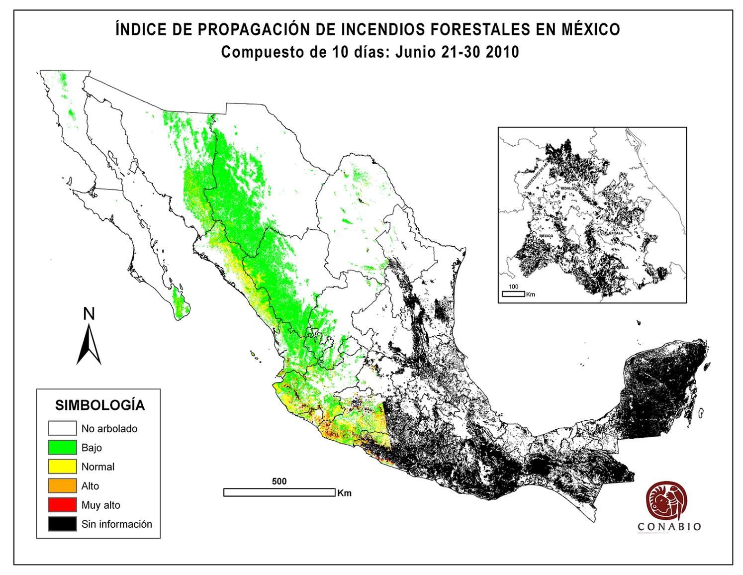 Indica el riesgo de propagación de incendios forestales. Se basa exclusivamente en el vigor de la vegetación, cuanto más seca está la vegetación, más rápido se podrá extender el posible fuego (incendio). Los valores para el índice son: Bajo -> Normal -> Alto -> Muy alto NA (No aplica) se refiere al agua, vegetación no arbolada y los usos de suelo mostrados en gris. ND (No disponible) indica que no hubo información para generar el índice. |