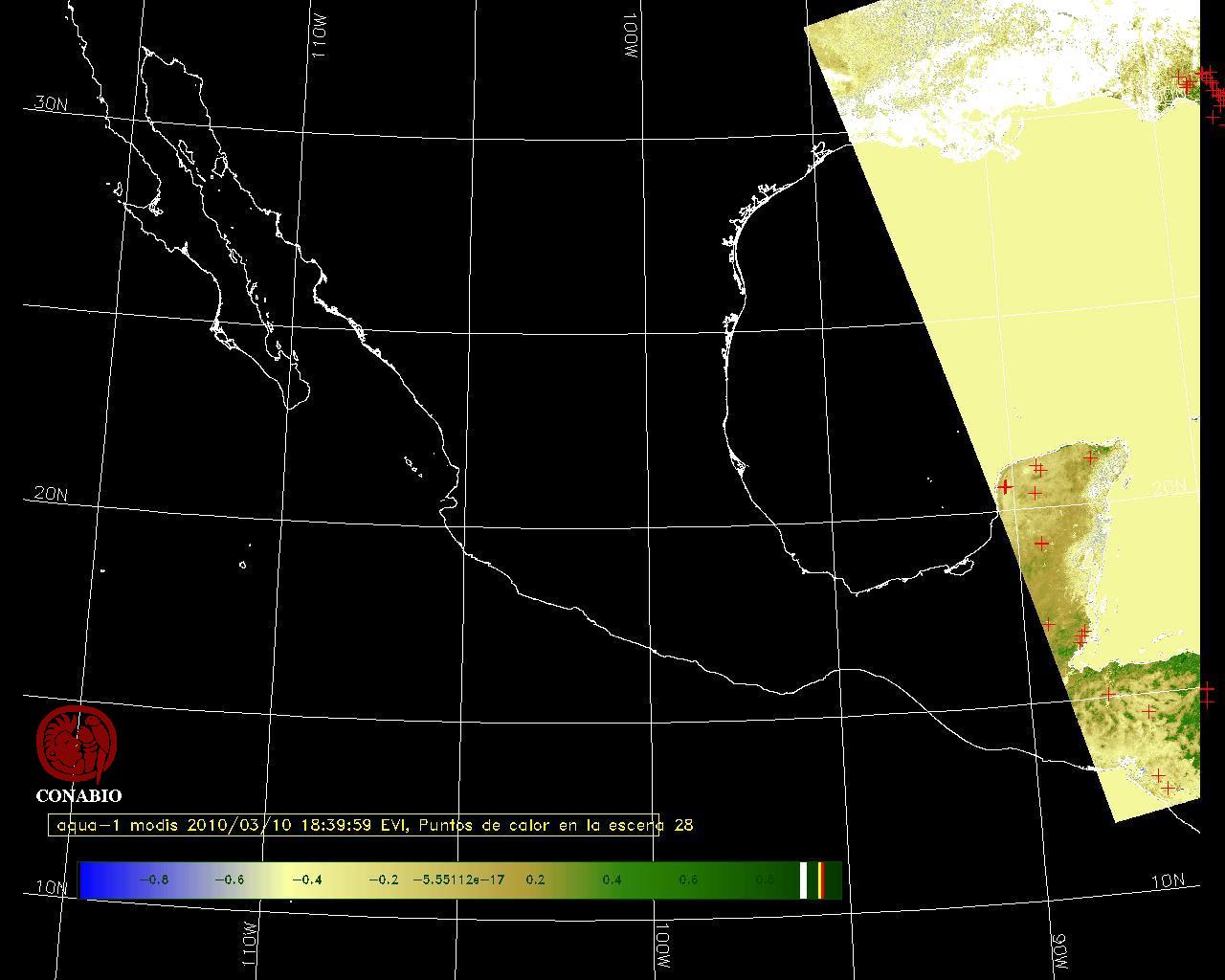 Se considera como punto de calor al elemento espacial mínimo de la imagen (pixel) que reporta una temperatura elevada. Para las imágenes diurnas la temperatura mínima considera es de 42 C y para las imágenes nocturnas es de 25 C. |