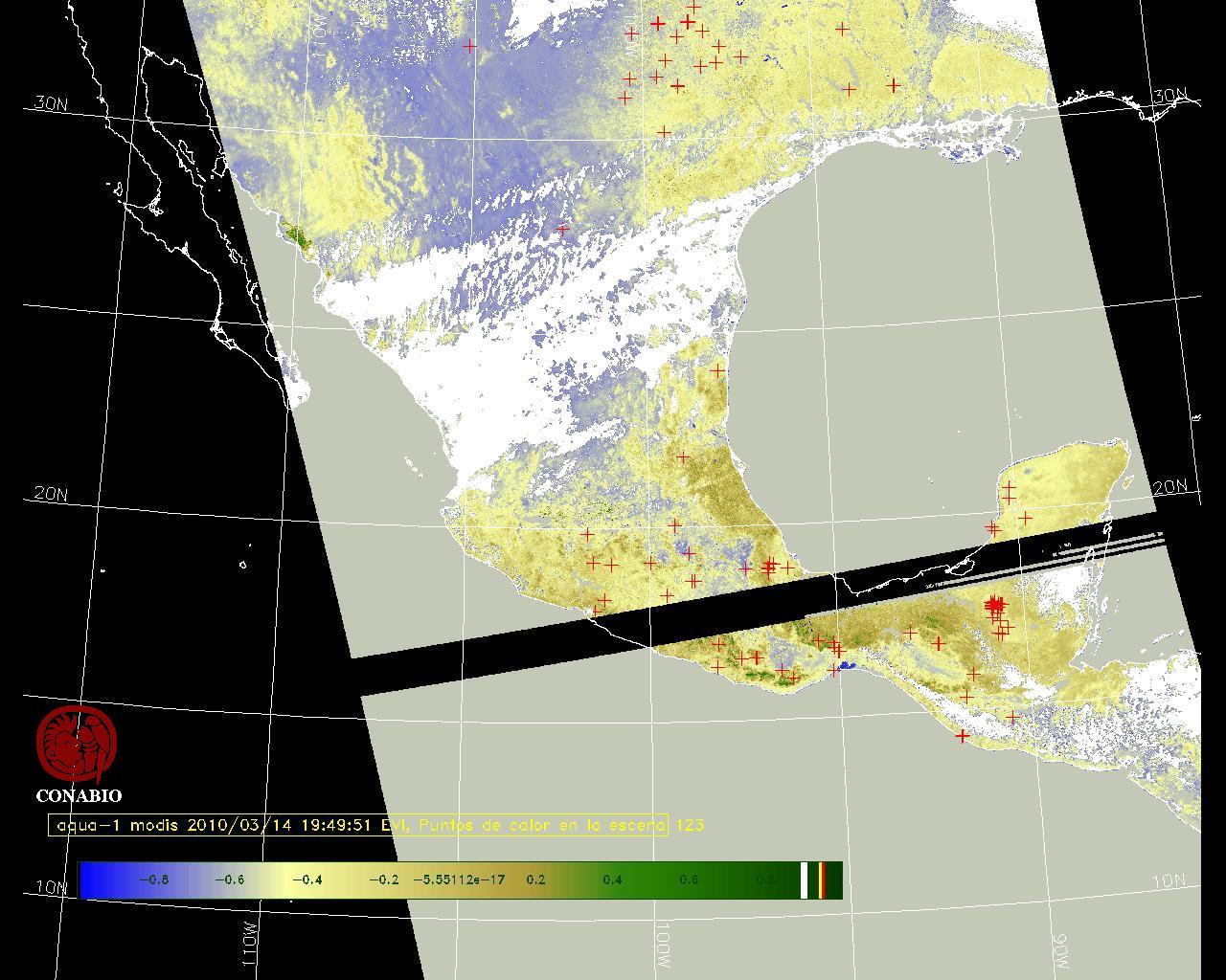 Se considera como punto de calor al elemento espacial mínimo de la imagen (pixel) que reporta una temperatura elevada. Para las imágenes diurnas la temperatura mínima considera es de 42 C y para las imágenes nocturnas es de 25 C. |