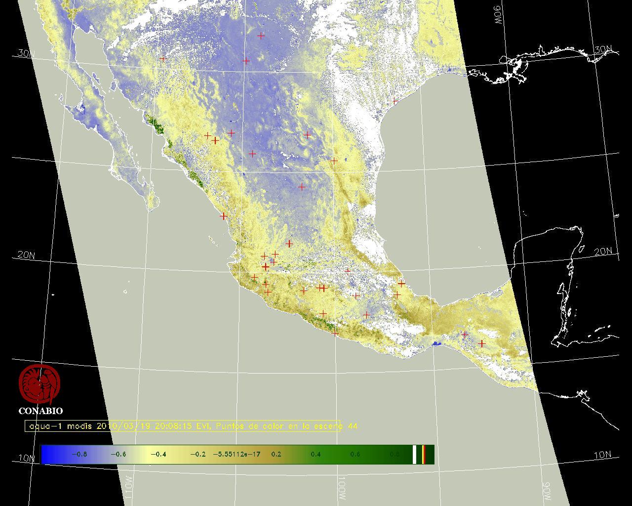 Se considera como punto de calor al elemento espacial mínimo de la imagen (pixel) que reporta una temperatura elevada. Para las imágenes diurnas la temperatura mínima considera es de 42 C y para las imágenes nocturnas es de 25 C. |