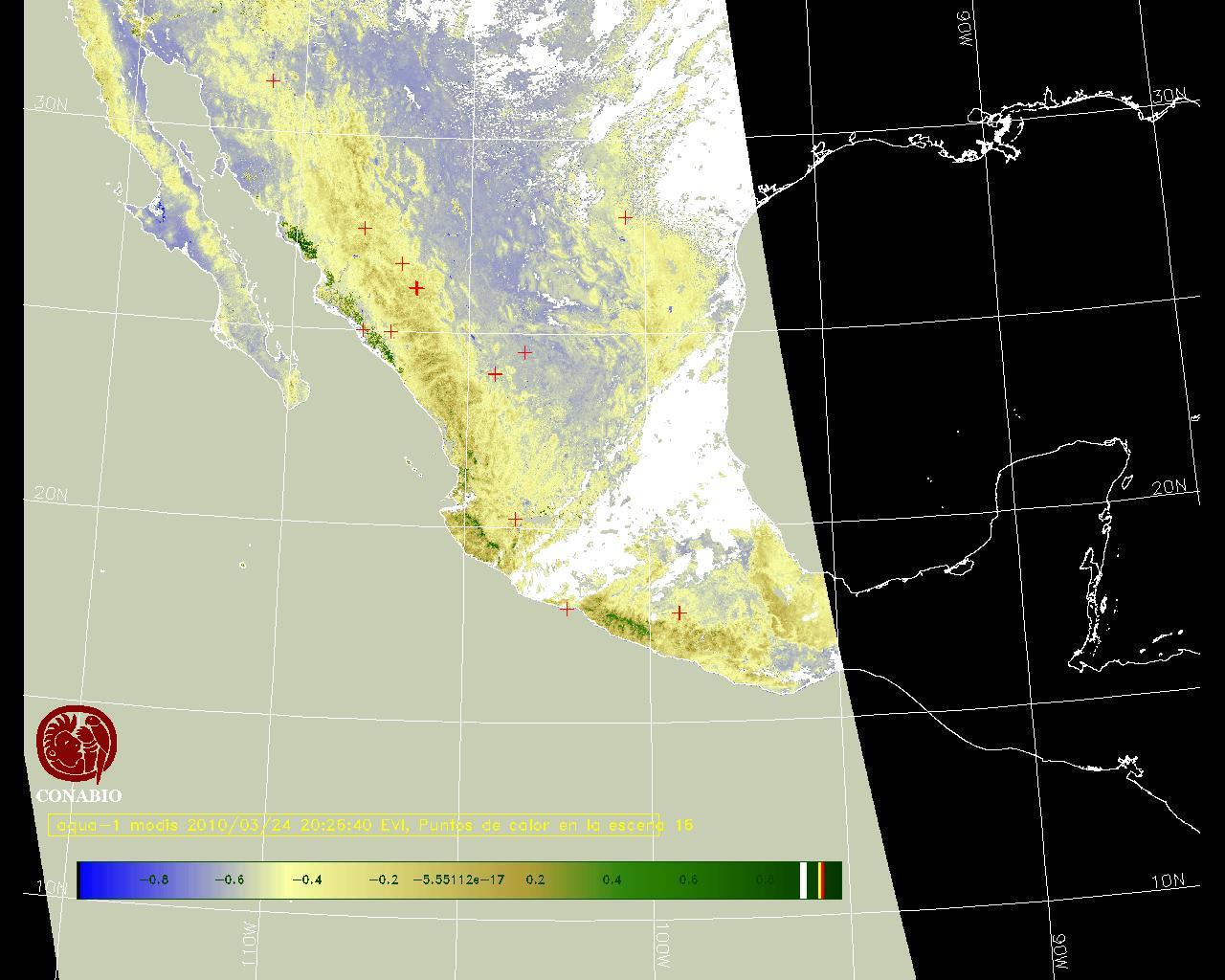 Se considera como punto de calor al elemento espacial mínimo de la imagen (pixel) que reporta una temperatura elevada. Para las imágenes diurnas la temperatura mínima considera es de 42 C y para las imágenes nocturnas es de 25 C. |