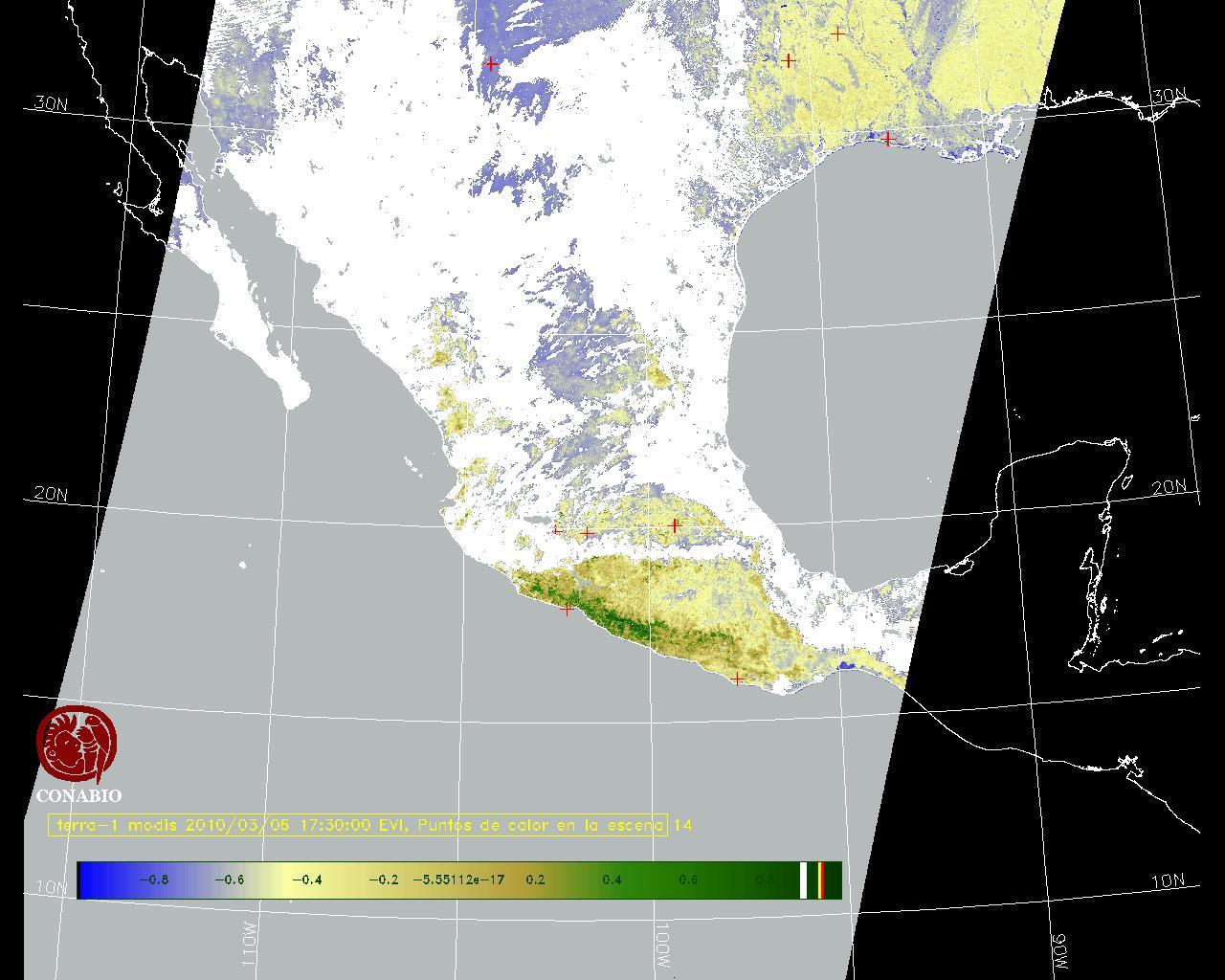 Se considera como punto de calor al elemento espacial mínimo de la imagen (pixel) que reporta una temperatura elevada. Para las imágenes diurnas la temperatura mínima considera es de 42 C y para las imágenes nocturnas es de 25 C. |