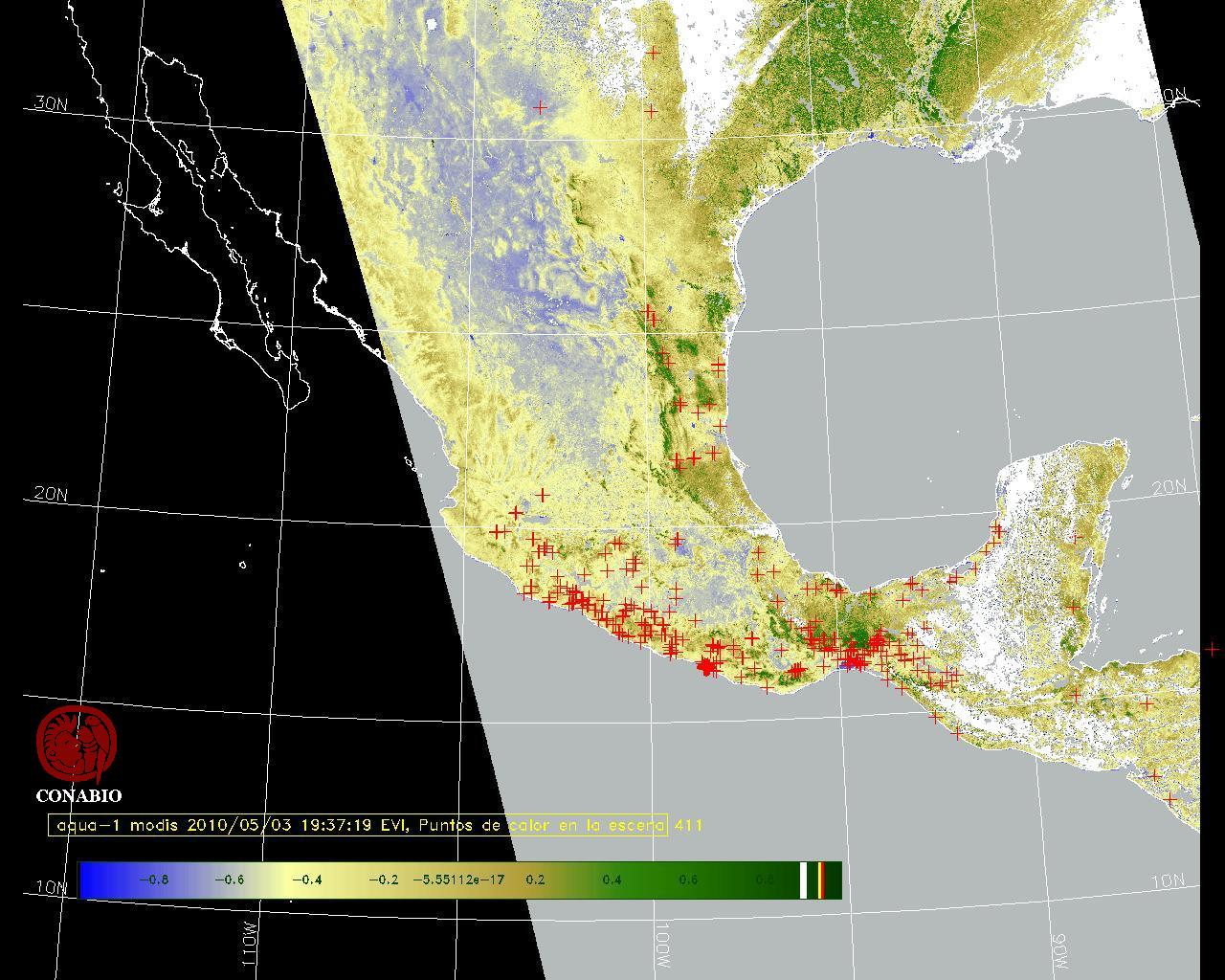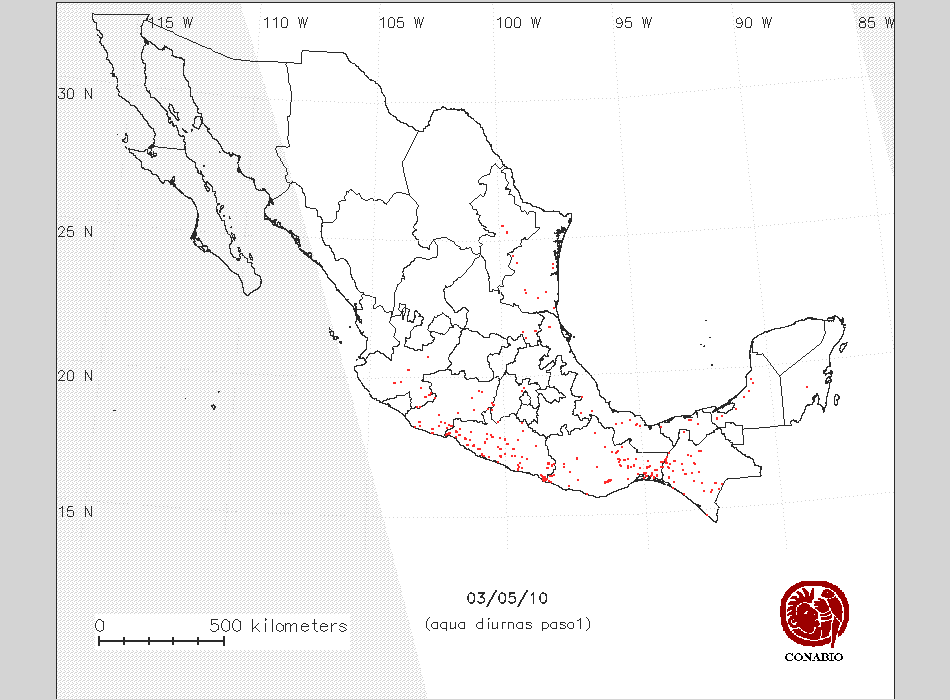 Se considera como punto de calor al elemento espacial mínimo de la imagen (pixel) que reporta una temperatura elevada. Para las imágenes diurnas la temperatura mínima considera es de 42 C y para las imágenes nocturnas es de 25 C. |