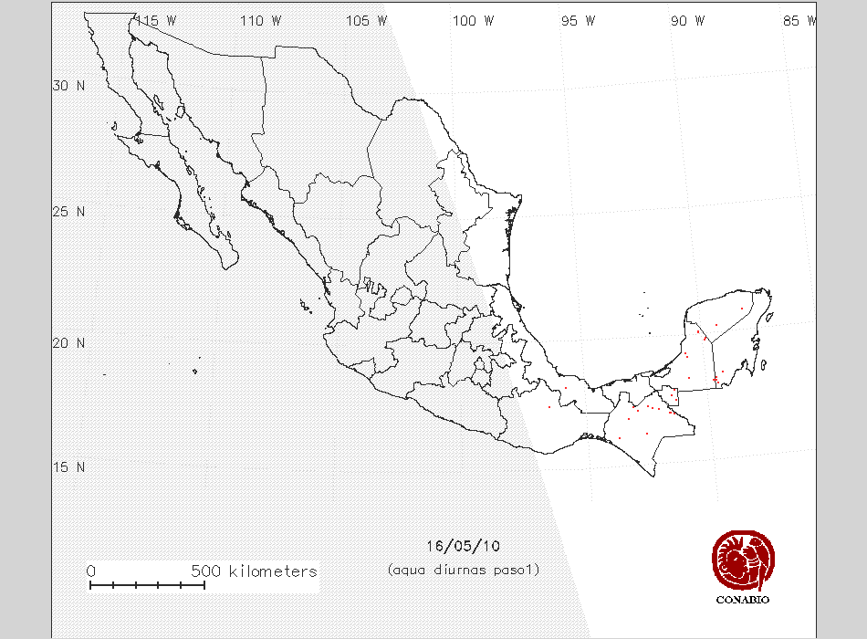 Se considera como punto de calor al elemento espacial mínimo de la imagen (pixel) que reporta una temperatura elevada. Para las imágenes diurnas la temperatura mínima considera es de 42 C y para las imágenes nocturnas es de 25 C. |