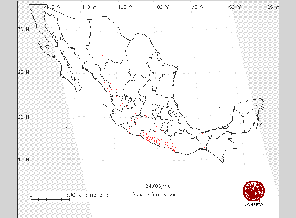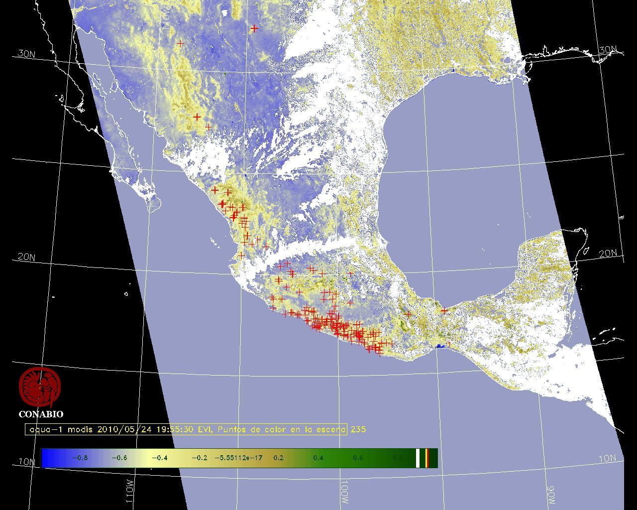 Se considera como punto de calor al elemento espacial mínimo de la imagen (pixel) que reporta una temperatura elevada. Para las imágenes diurnas la temperatura mínima considera es de 42 C y para las imágenes nocturnas es de 25 C. |