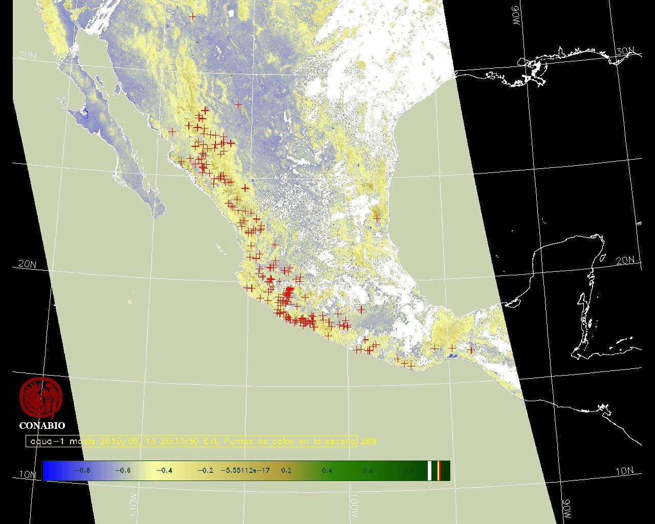 Se considera como punto de calor al elemento espacial mínimo de la imagen (pixel) que reporta una temperatura elevada. Para las imágenes diurnas la temperatura mínima considera es de 42 C y para las imágenes nocturnas es de 25 C. |