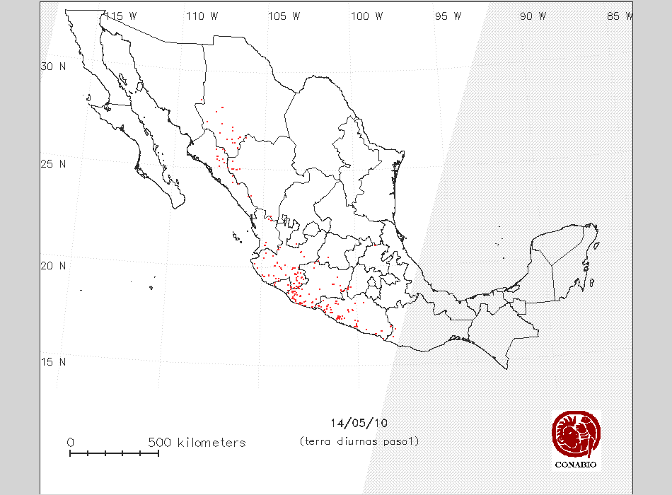 Se considera como punto de calor al elemento espacial mínimo de la imagen (pixel) que reporta una temperatura elevada. Para las imágenes diurnas la temperatura mínima considera es de 42 C y para las imágenes nocturnas es de 25 C. |