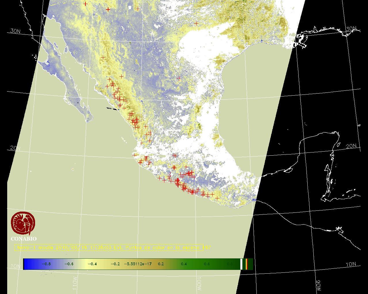 Se considera como punto de calor al elemento espacial mínimo de la imagen (pixel) que reporta una temperatura elevada. Para las imágenes diurnas la temperatura mínima considera es de 42 C y para las imágenes nocturnas es de 25 C. |