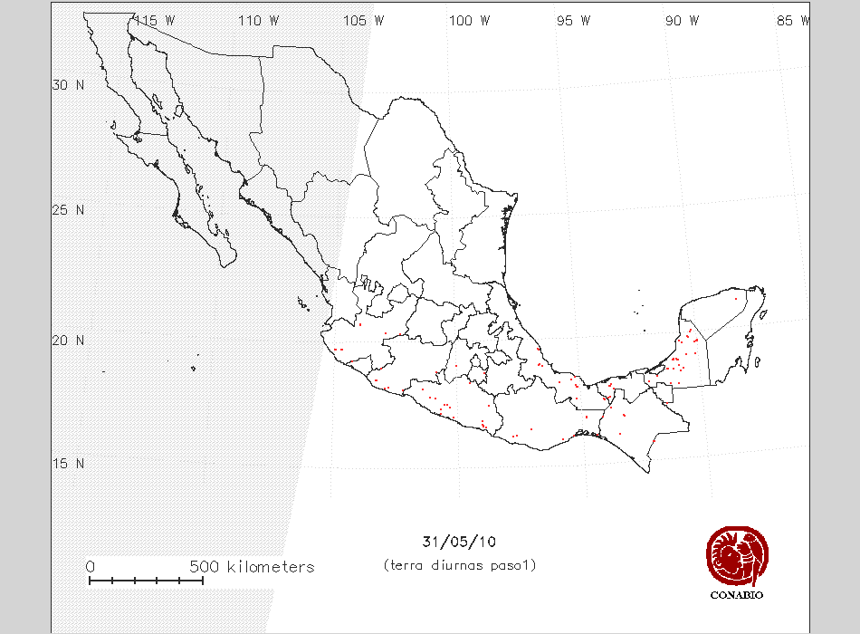 Se considera como punto de calor al elemento espacial mínimo de la imagen (pixel) que reporta una temperatura elevada. Para las imágenes diurnas la temperatura mínima considera es de 42 C y para las imágenes nocturnas es de 25 C. |