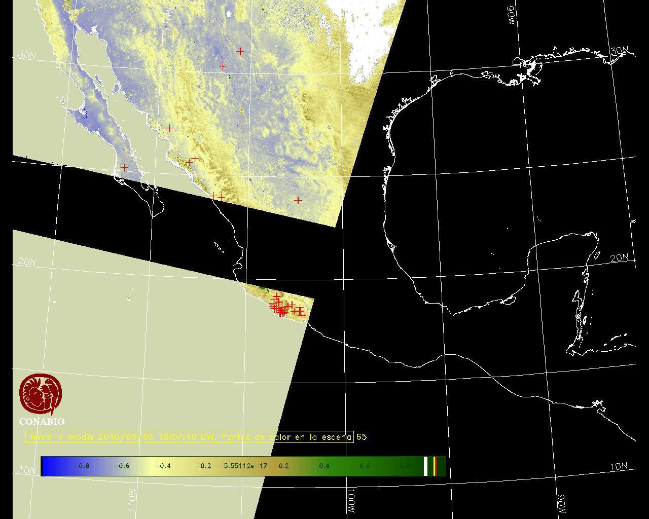 Se considera como punto de calor al elemento espacial mínimo de la imagen (pixel) que reporta una temperatura elevada. Para las imágenes diurnas la temperatura mínima considera es de 42 C y para las imágenes nocturnas es de 25 C. |