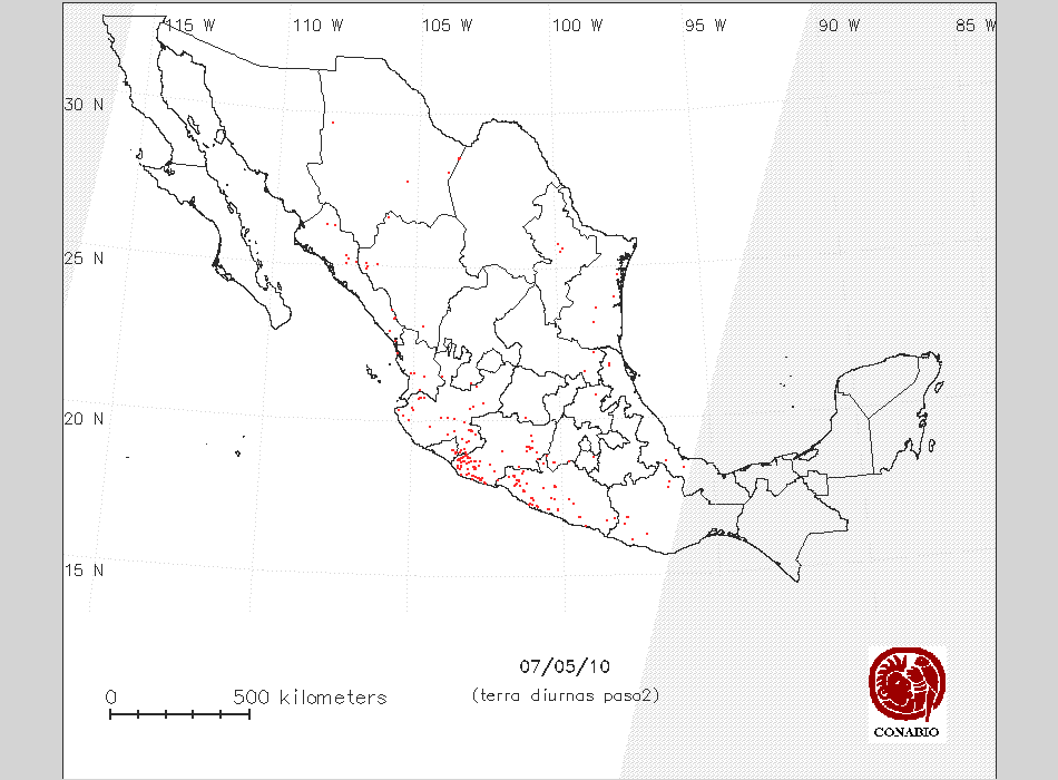 Se considera como punto de calor al elemento espacial mínimo de la imagen (pixel) que reporta una temperatura elevada. Para las imágenes diurnas la temperatura mínima considera es de 42 C y para las imágenes nocturnas es de 25 C. |