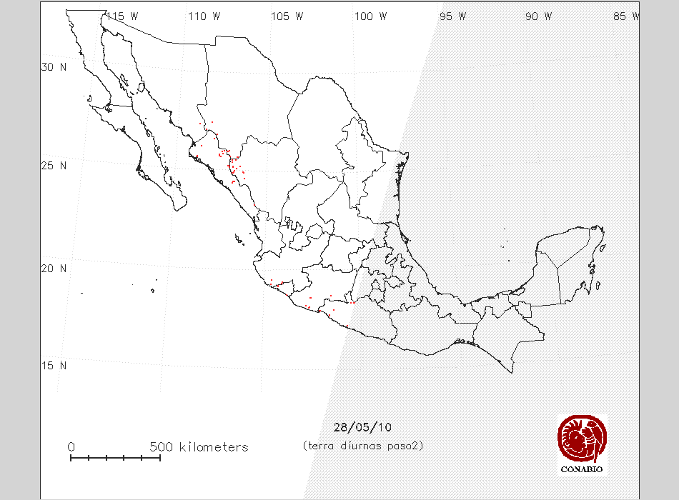 Se considera como punto de calor al elemento espacial mínimo de la imagen (pixel) que reporta una temperatura elevada. Para las imágenes diurnas la temperatura mínima considera es de 42 C y para las imágenes nocturnas es de 25 C. |