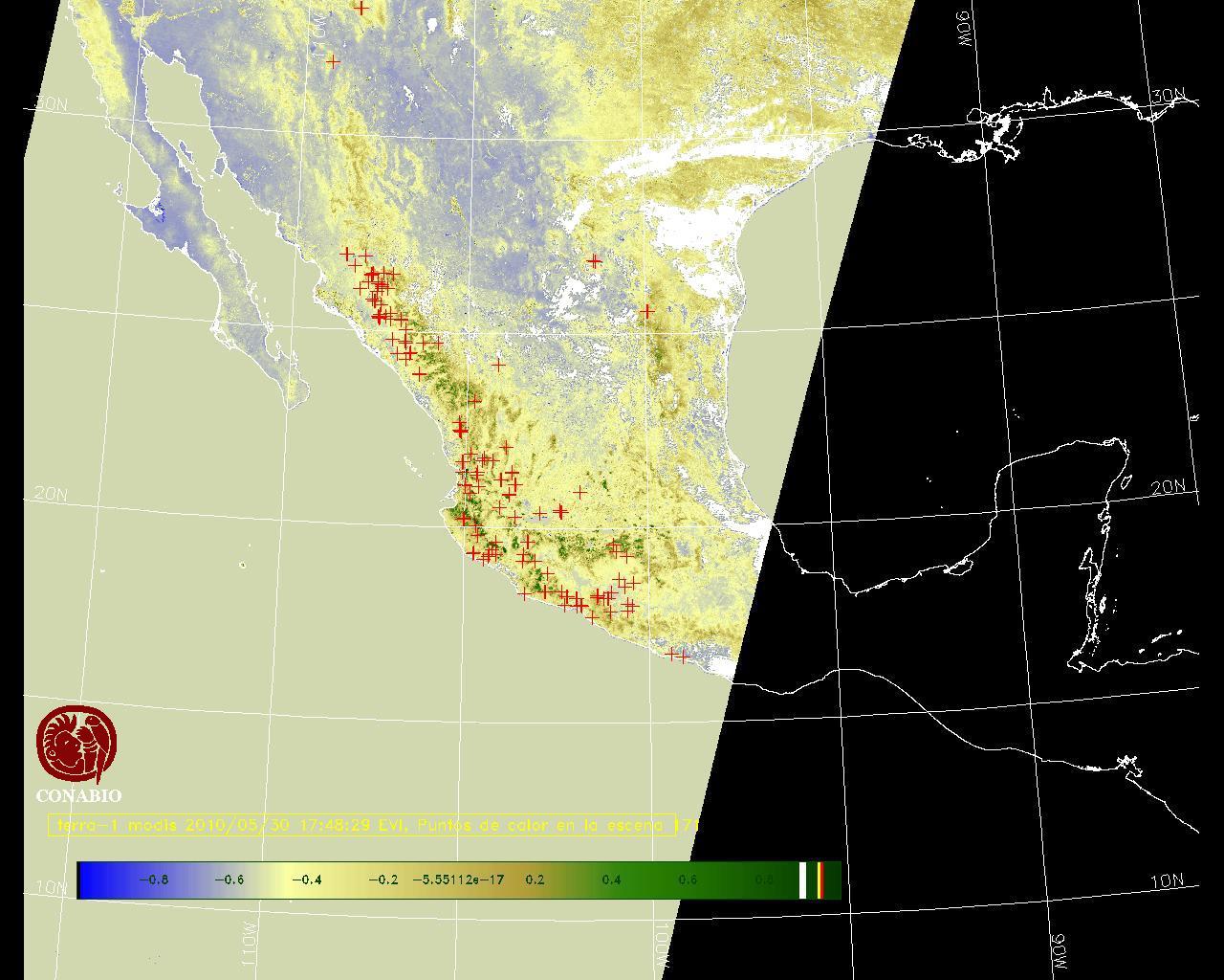 Se considera como punto de calor al elemento espacial mínimo de la imagen (pixel) que reporta una temperatura elevada. Para las imágenes diurnas la temperatura mínima considera es de 42 C y para las imágenes nocturnas es de 25 C. |