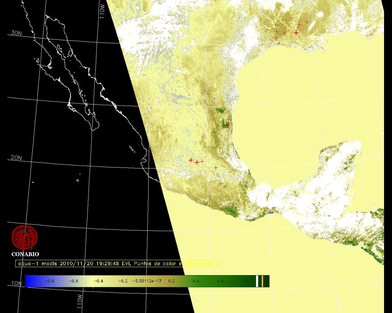 Se considera como punto de calor al elemento espacial mínimo de la imagen (pixel) que reporta una temperatura elevada. Para las imágenes diurnas la temperatura mínima considera es de 42 C y para las imágenes nocturnas es de 25 C. |