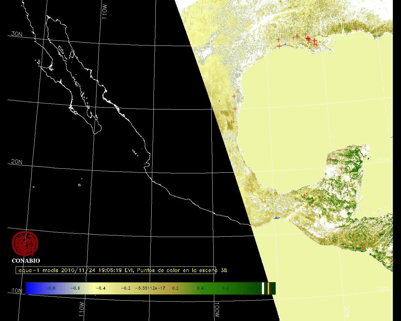 Se considera como punto de calor al elemento espacial mínimo de la imagen (pixel) que reporta una temperatura elevada. Para las imágenes diurnas la temperatura mínima considera es de 42 C y para las imágenes nocturnas es de 25 C. |
