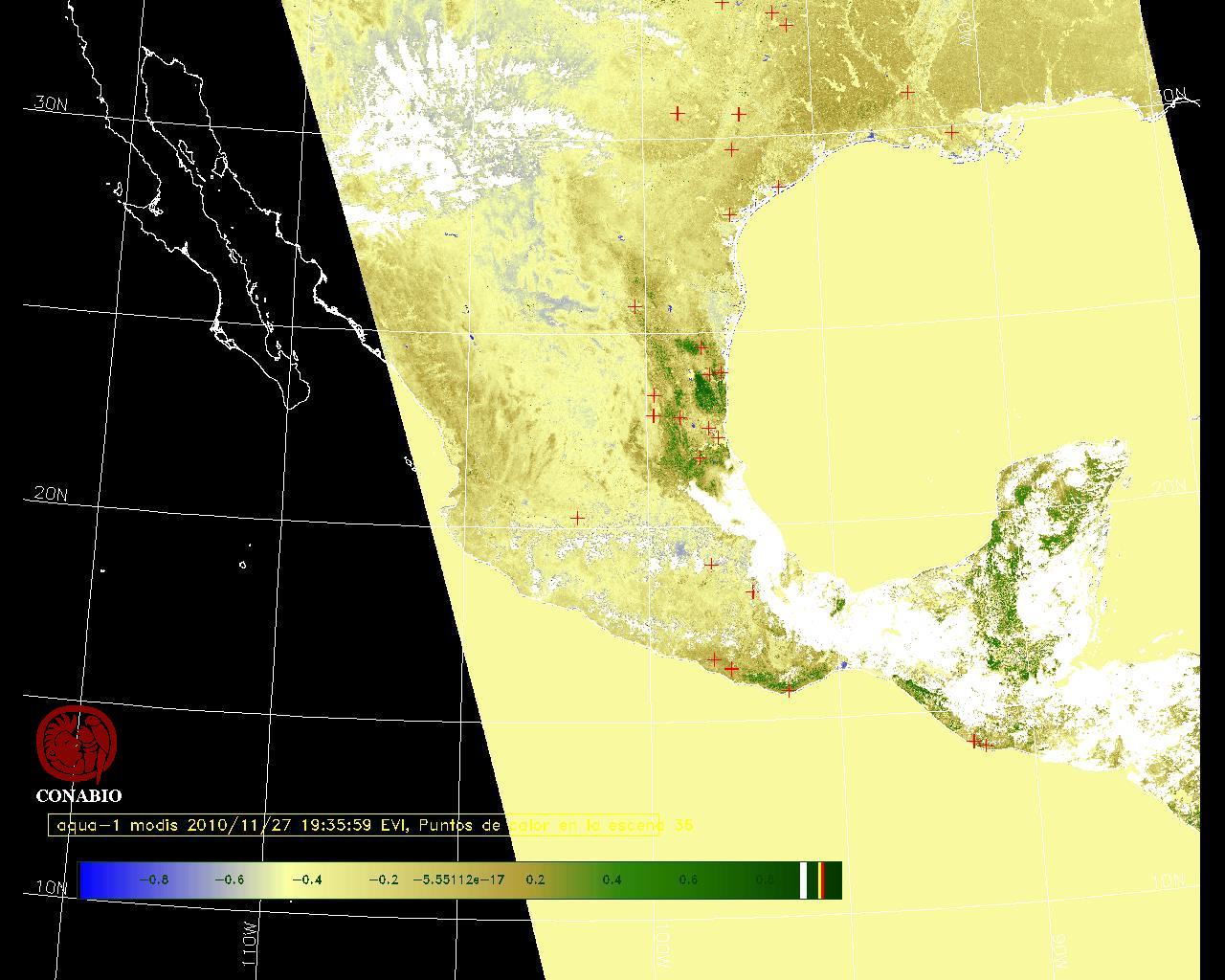 Los valores del índice van de -1 a 1, entre más cercano al valor 1 la vegetación presenta mayor vigor. Los índices de vegetación son utilizados para conocer el comportamiento de la vegetación tanto espacial como temporal. |