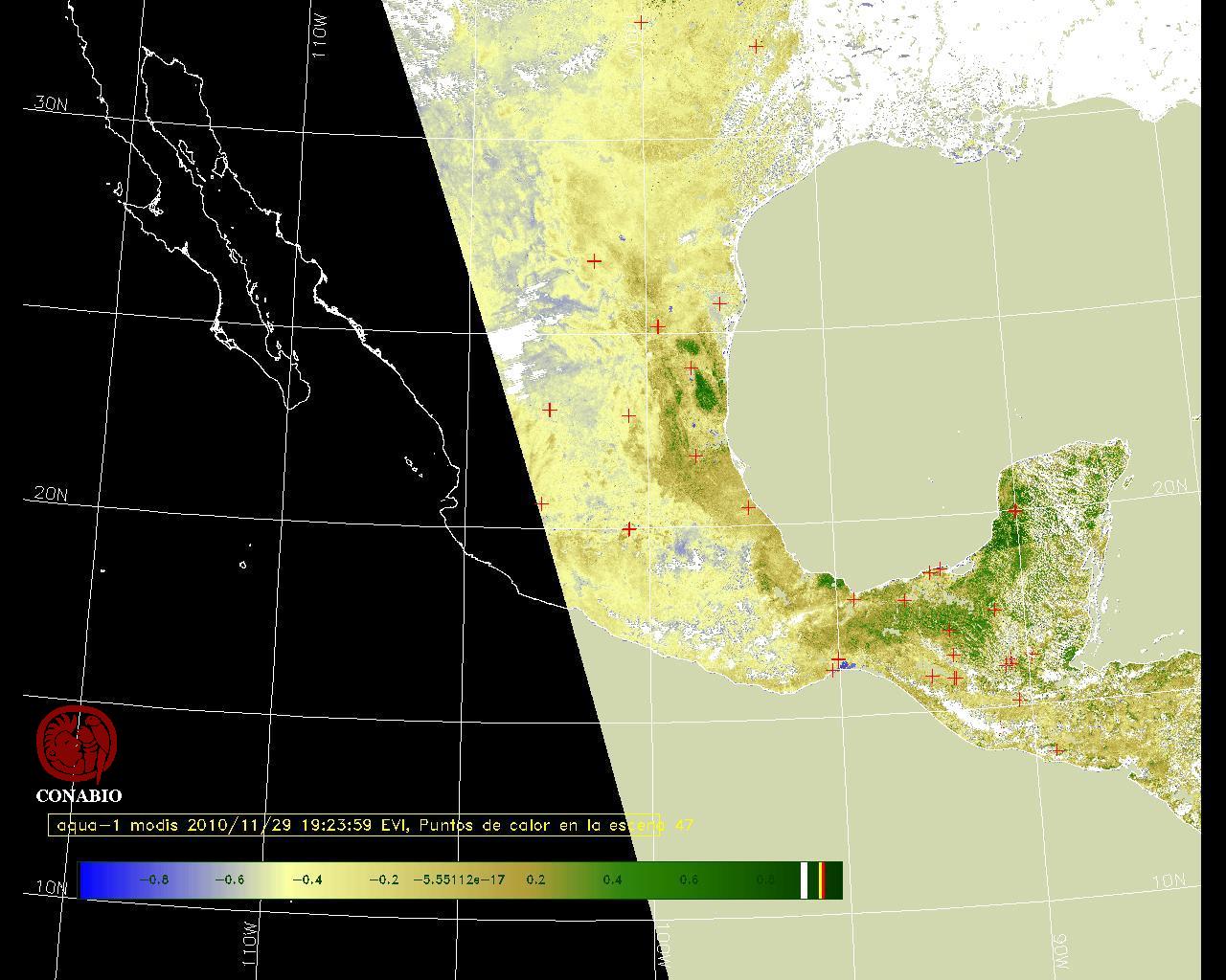Se considera como punto de calor al elemento espacial mínimo de la imagen (pixel) que reporta una temperatura elevada. Para las imágenes diurnas la temperatura mínima considera es de 42 C y para las imágenes nocturnas es de 25 C. |