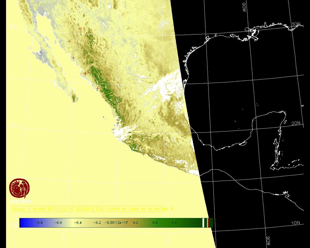 Se considera como punto de calor al elemento espacial mínimo de la imagen (pixel) que reporta una temperatura elevada. Para las imágenes diurnas la temperatura mínima considera es de 42 C y para las imágenes nocturnas es de 25 C. |
