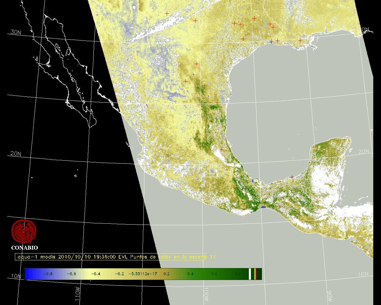 Se considera como punto de calor al elemento espacial mínimo de la imagen (pixel) que reporta una temperatura elevada. Para las imágenes diurnas la temperatura mínima considera es de 42 C y para las imágenes nocturnas es de 25 C. |