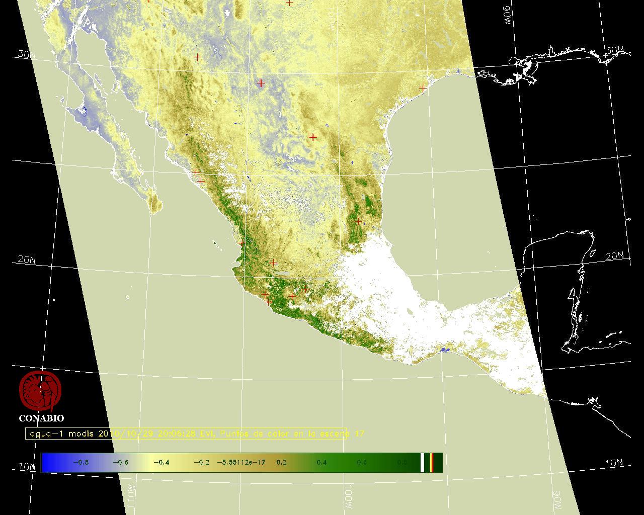 Se considera como punto de calor al elemento espacial mínimo de la imagen (pixel) que reporta una temperatura elevada. Para las imágenes diurnas la temperatura mínima considera es de 42 C y para las imágenes nocturnas es de 25 C. |