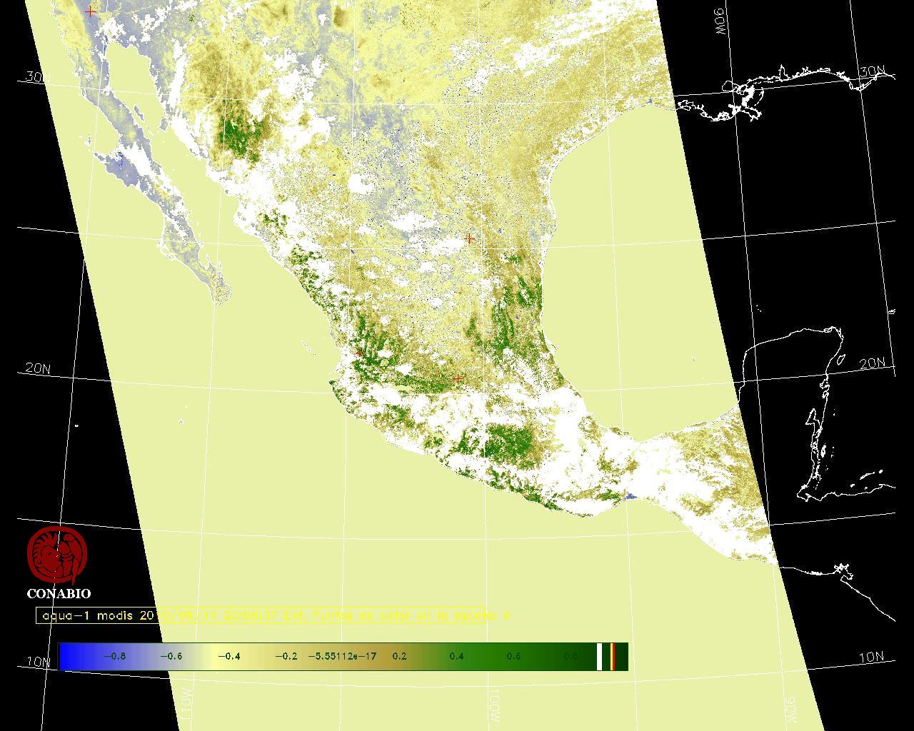 Se considera como punto de calor al elemento espacial mínimo de la imagen (pixel) que reporta una temperatura elevada. Para las imágenes diurnas la temperatura mínima considera es de 42 C y para las imágenes nocturnas es de 25 C. |