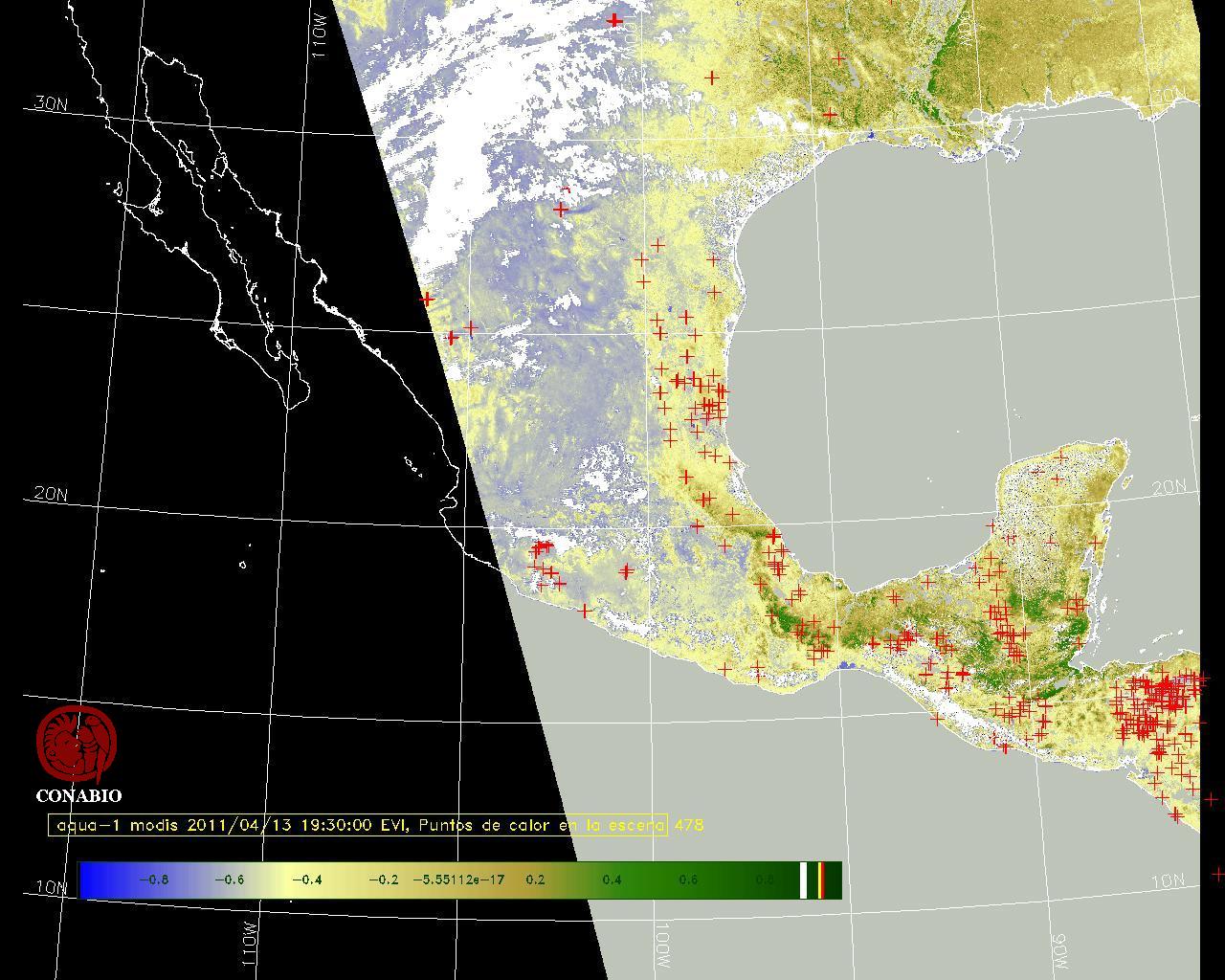 Se considera como punto de calor al elemento espacial mínimo de la imagen (pixel) que reporta una temperatura elevada. Para las imágenes diurnas la temperatura mínima considera es de 42 C y para las imágenes nocturnas es de 25 C. |