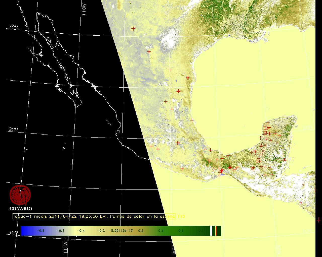 Se considera como punto de calor al elemento espacial mínimo de la imagen (pixel) que reporta una temperatura elevada. Para las imágenes diurnas la temperatura mínima considera es de 42 C y para las imágenes nocturnas es de 25 C. |