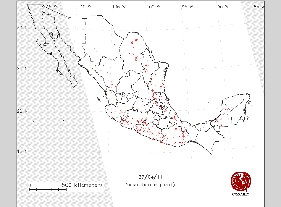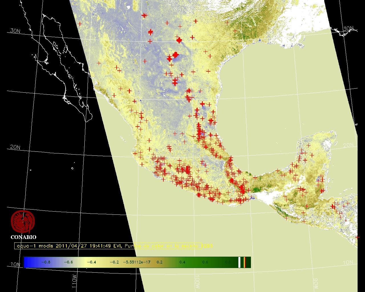 Se considera como punto de calor al elemento espacial mínimo de la imagen (pixel) que reporta una temperatura elevada. Para las imágenes diurnas la temperatura mínima considera es de 42 C y para las imágenes nocturnas es de 25 C. |