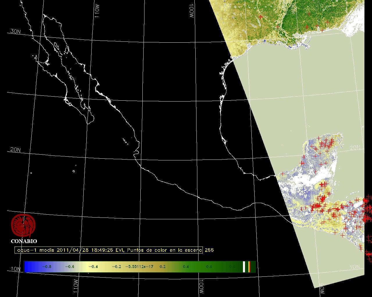 Se considera como punto de calor al elemento espacial mínimo de la imagen (pixel) que reporta una temperatura elevada. Para las imágenes diurnas la temperatura mínima considera es de 42 C y para las imágenes nocturnas es de 25 C. |