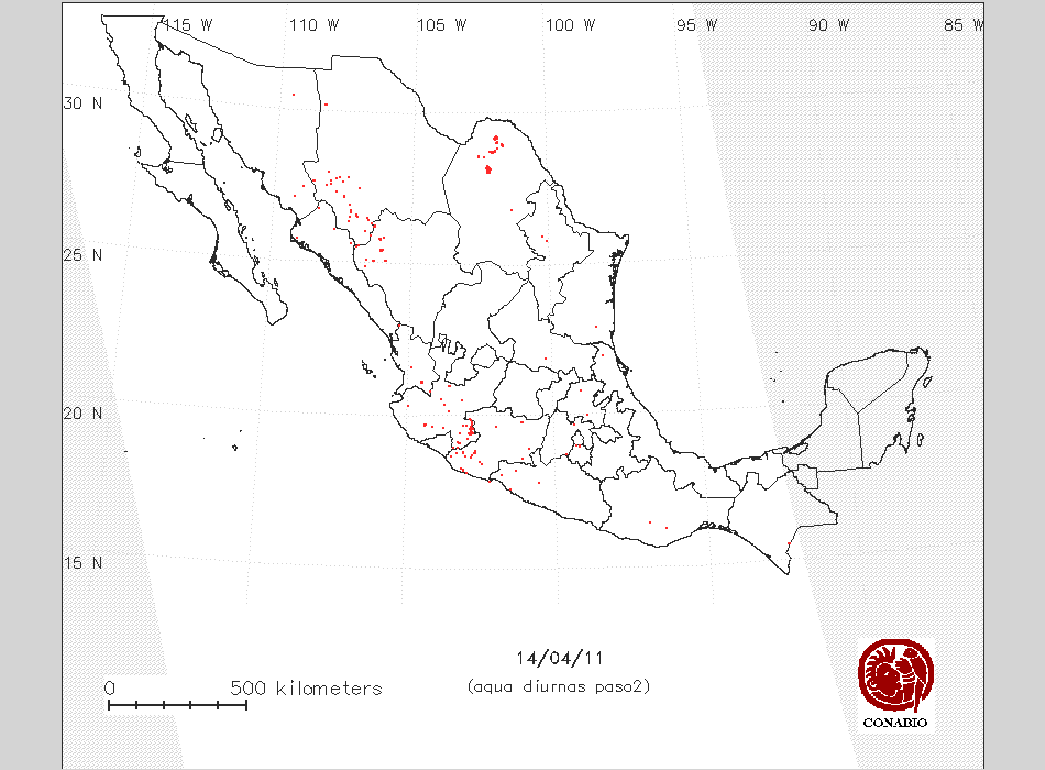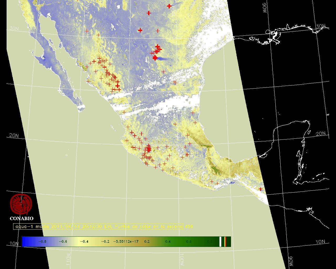 Se considera como punto de calor al elemento espacial mínimo de la imagen (pixel) que reporta una temperatura elevada. Para las imágenes diurnas la temperatura mínima considera es de 42 C y para las imágenes nocturnas es de 25 C. |