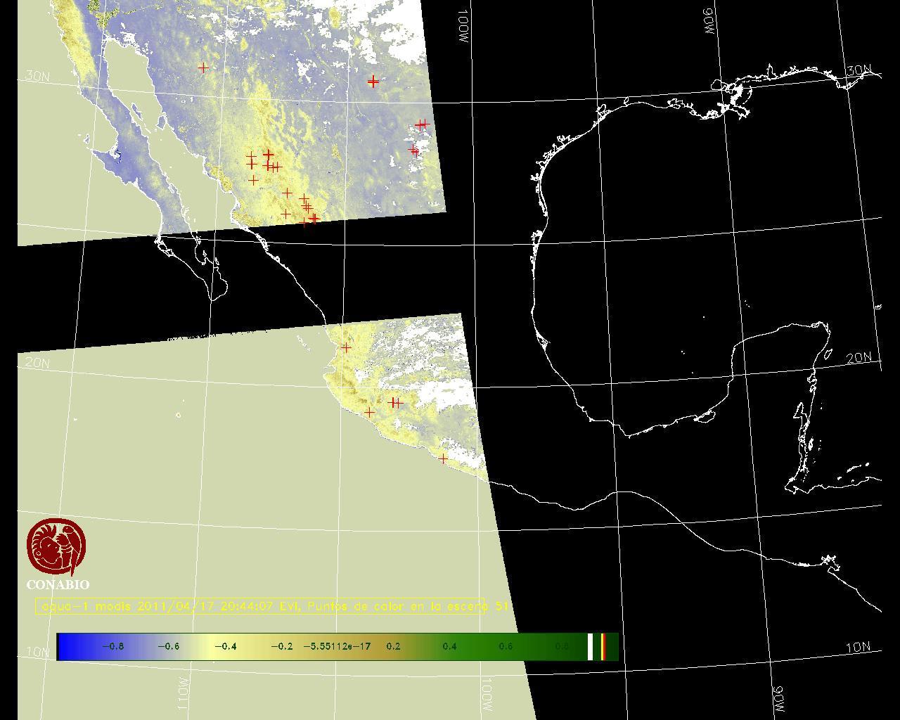 Se considera como punto de calor al elemento espacial mínimo de la imagen (pixel) que reporta una temperatura elevada. Para las imágenes diurnas la temperatura mínima considera es de 42 C y para las imágenes nocturnas es de 25 C. |